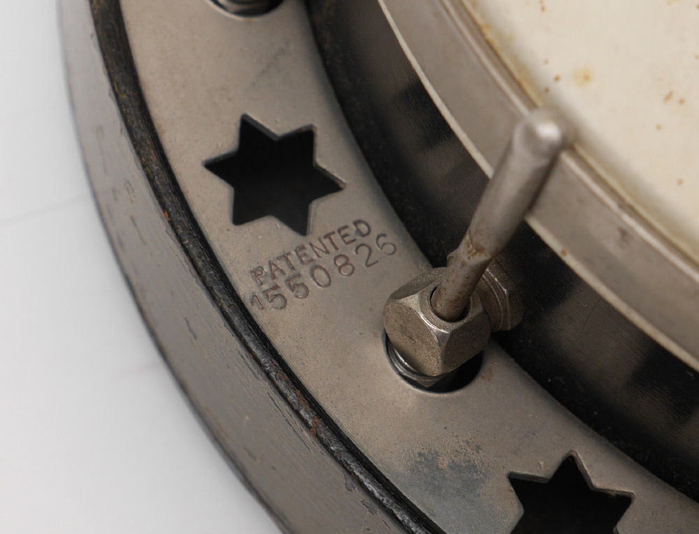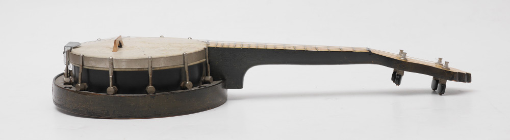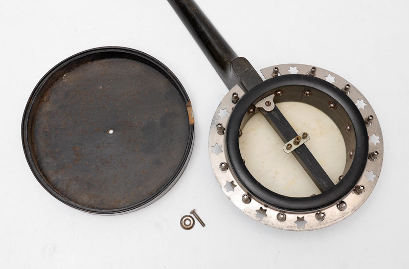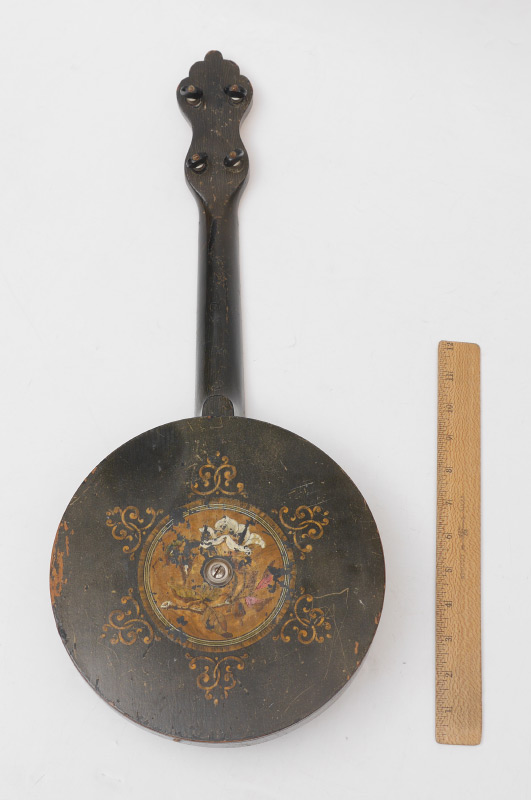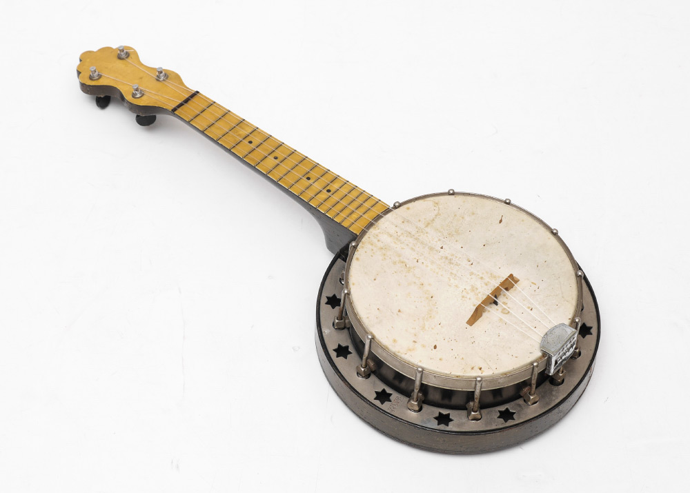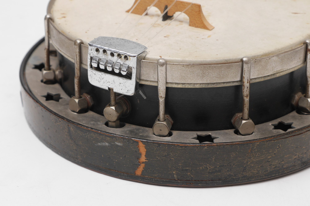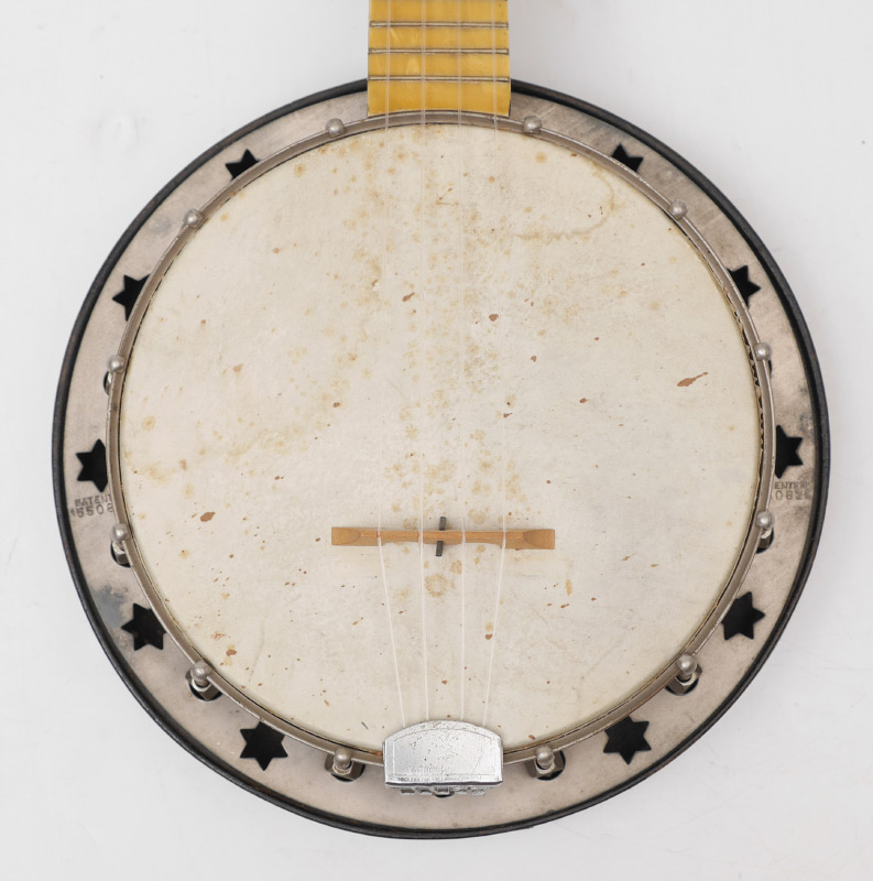 MONARCH STYLE VINTAGE BANJO UKULELE BANJOLELE: Paint decorated back, green painted body, resonator with star pierced decoration and patent number. 4 string, no marks as to maker inside or out. Overall measures 21 3/4'' x 9'' x 3 1/2''.