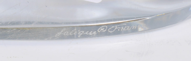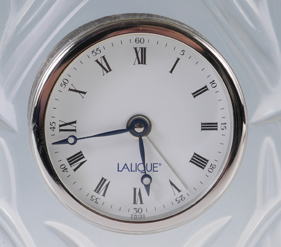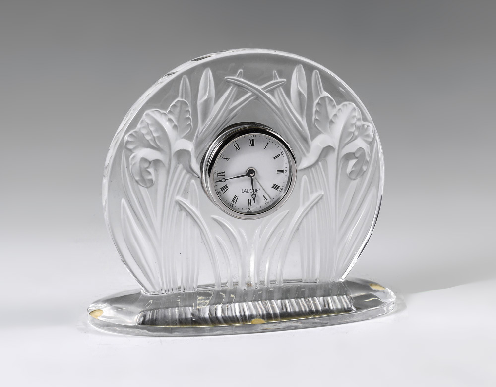 LALIQUE IRIS DESK CLOCK: Clear crystal with embossed iris flower designs, signed on rim of base. Quartz moment, overall measures 6 3/4'' x 8''.