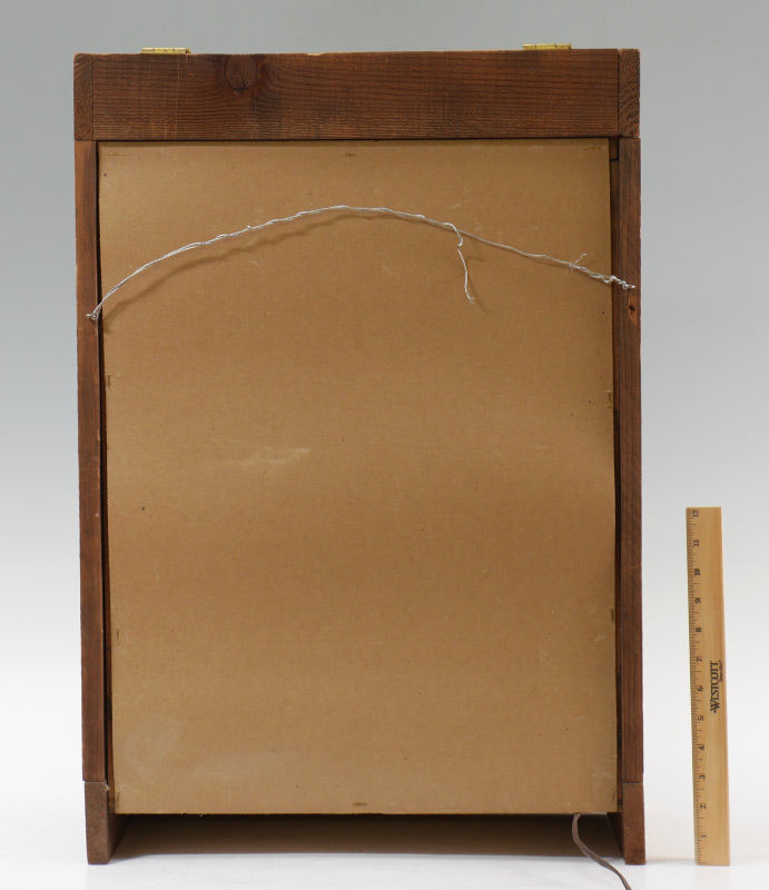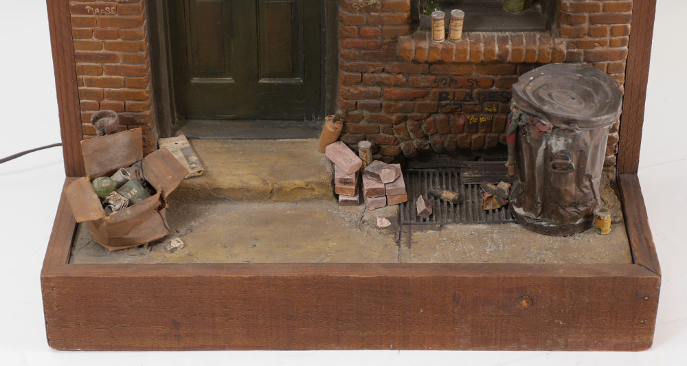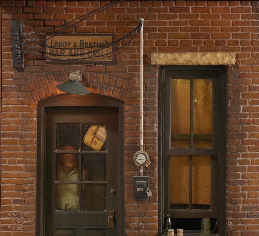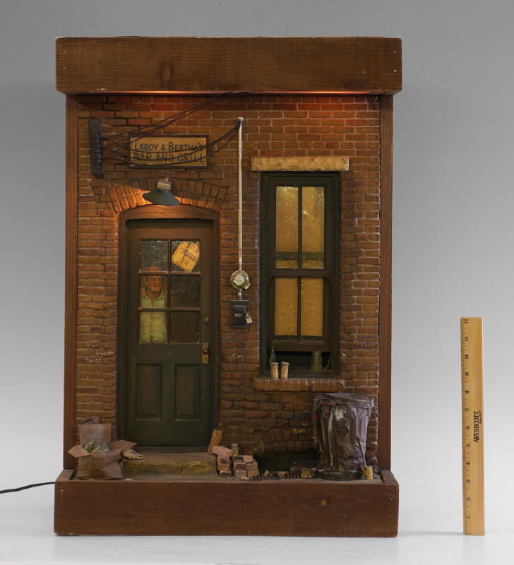 GARMAN, Michael, (American, 20th C): ''Leroy & Bertha's Bar and Grill'', diorama/shadowbox style sculpture depicting bar entrance including door, with older man staring out, and open window, dirty brick facade with signage and graffiti, cans, bottles, bricks and trash, light over door works, illuminated wood display, signed lower right corner of sidewalk. 27.75'' x 19'' x 9.75''.
