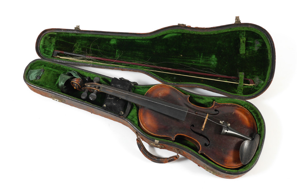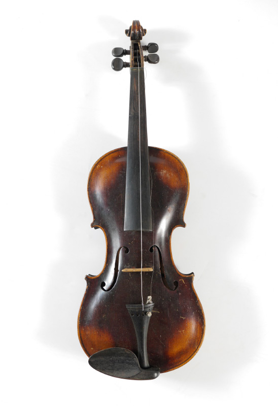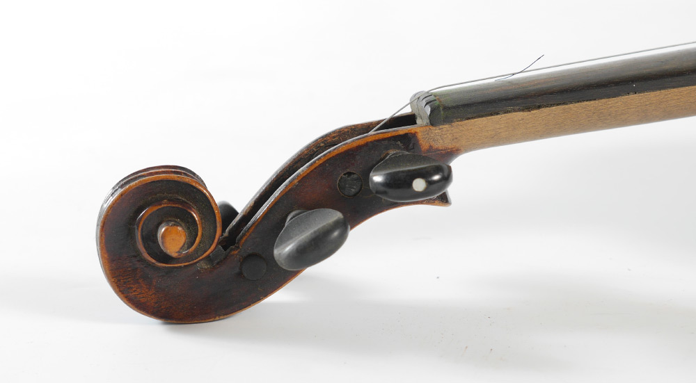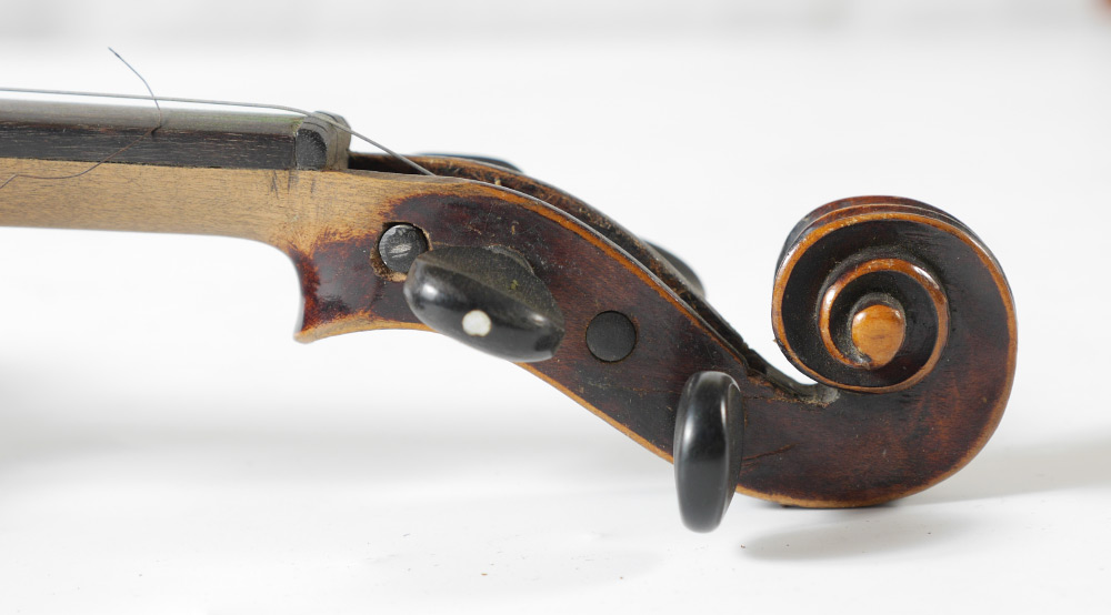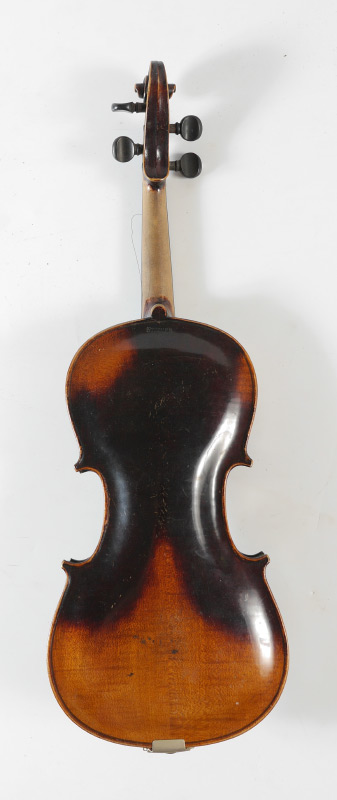 CONDITION: Uneven finish and scratches to violin, loss of leather to case.
