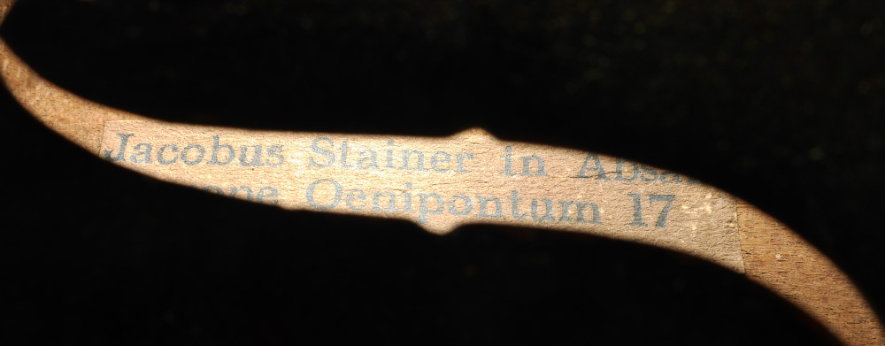 GERMAN LABELED JACOBUS STAINER VIOLIN: Impressed Stainer mark on 2 piece 14 1/2'' back, labeled Jacobus Stainer, Made in Germany interior. Overall measures 23 3/4'' long. Sold with illegibly signed bow. Velvet lined leather case measures 31 1/2'' h. x 9 3/4'' x 5''.