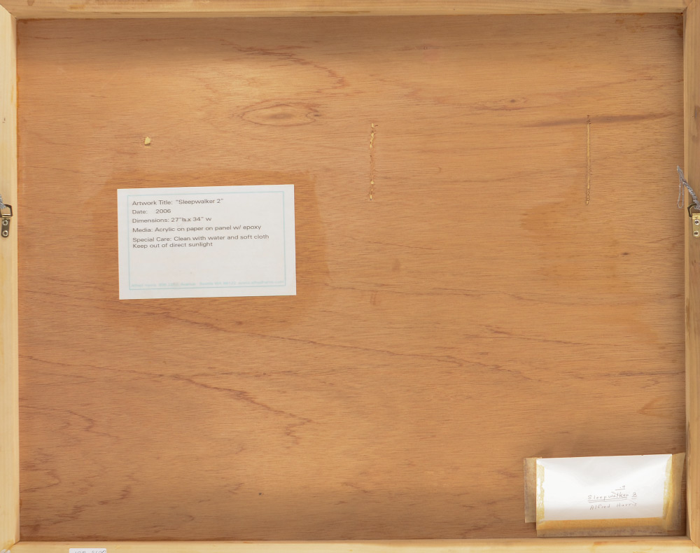 ALFRED HARRIS MODERN ARTWORK SLEEPWALK #2: Acrylic on Paper on Panel with Epoxy, 26.75'' x 34'', created in 2006, original label affixed verso.