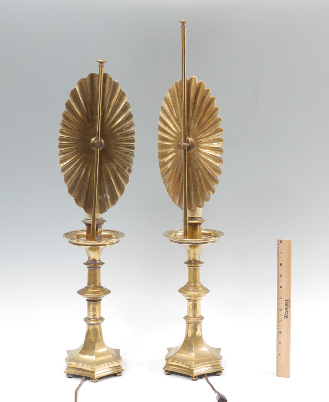 2 BRASS TABLE LAMPS: Similar, but not identical with subtle differences to sunburst motif backs and height. Unmarked, taller of the two measures 30 1/4'' h. x 6'' x 6''.