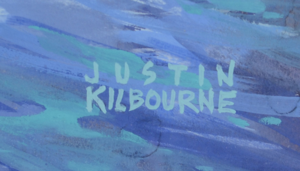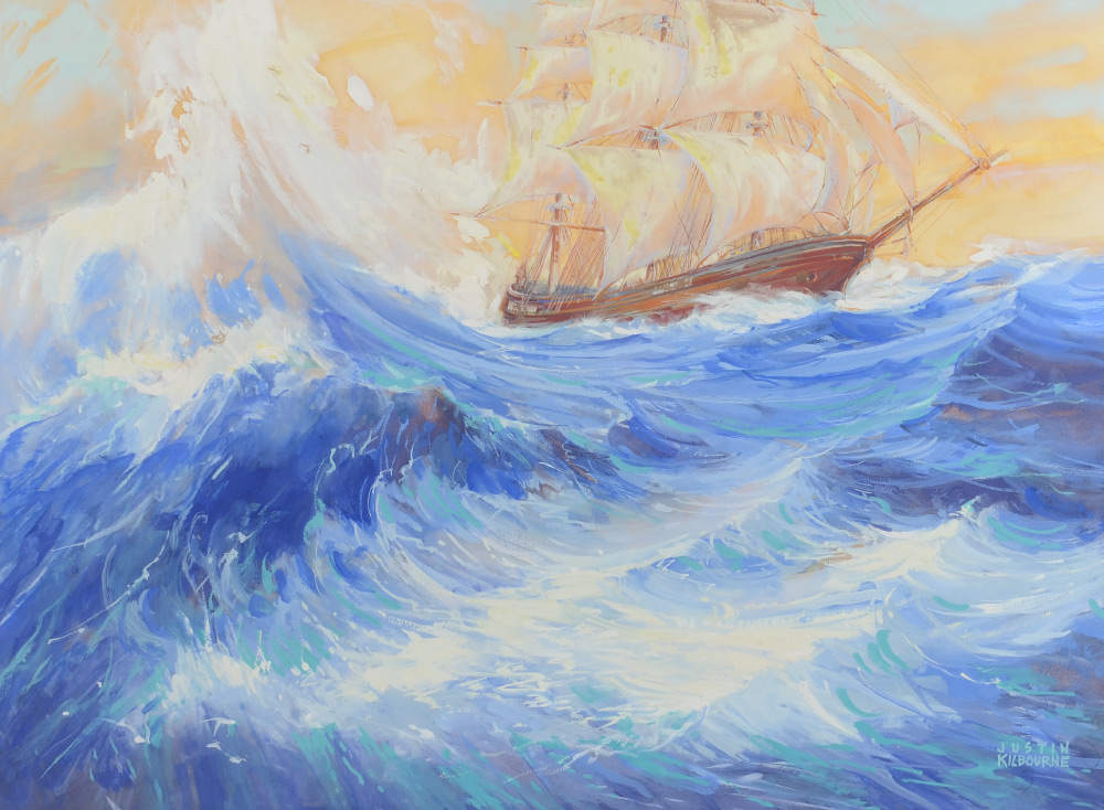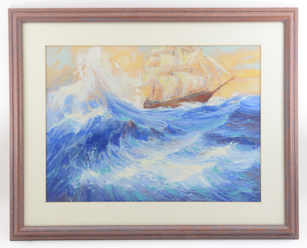 KILBOURNE, Justin, (American, 19-20th C): Clipper Ship in High Seas, Gouache, sight size 16'' x 22'', signed lower right, framed 24'' x 30''.