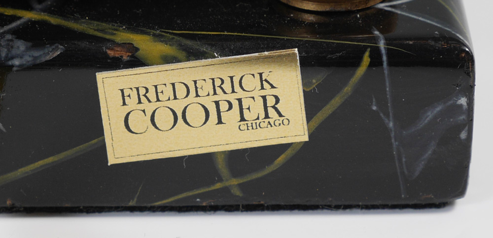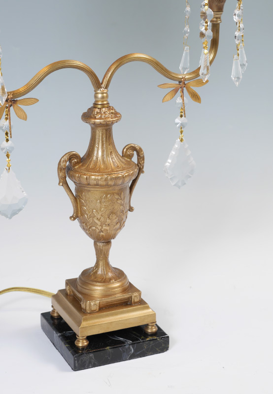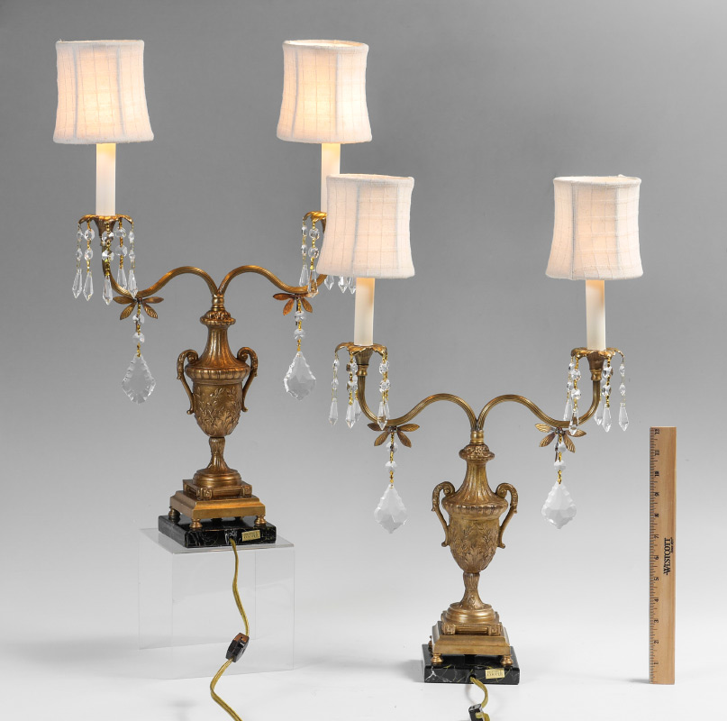 PAIR FREDERICK COOPER CANDELABRA LAMPS: Embossed urn form body, 2 shaped arm with applied dragonflies and crystal drops, faux marble bases marked Frederick Cooper, overall measures 19 3/4'' h. x 14'' x 4 1/2''.