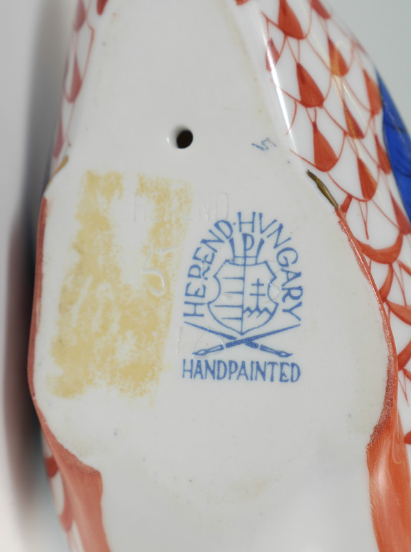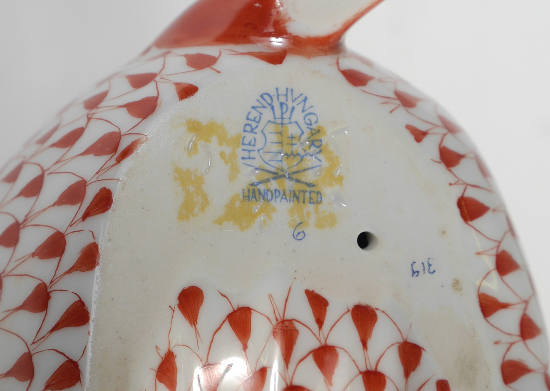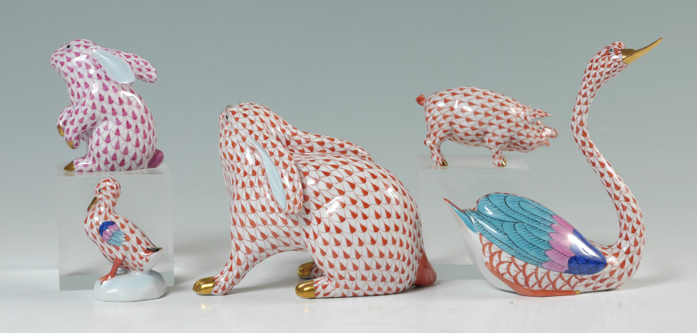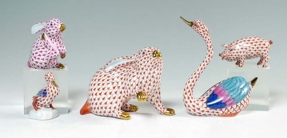 5 PIECE HEREND FISHNET PORCELAIN ANIMALS: 5 pieces total to include 1) Large rust rabbit, 4 1/4'' h. x 5 1/4'' x 3 1/4''. 2) Pink smaller rabbit, 3'' h. 3) Rust swan, 5 1/2'' h. 4) Rust pig, 3 1/2'' long. 5) Rust duck, 2 3/4''.