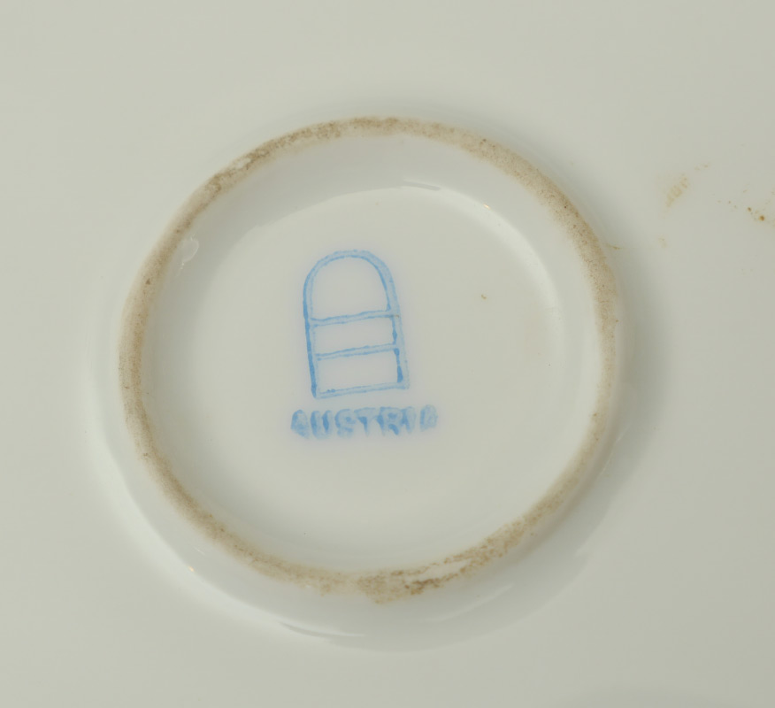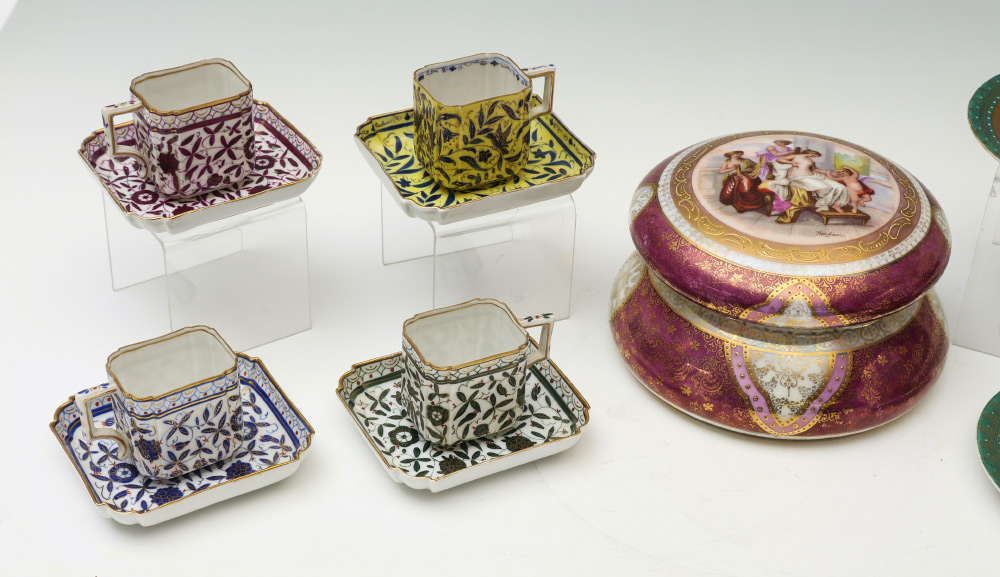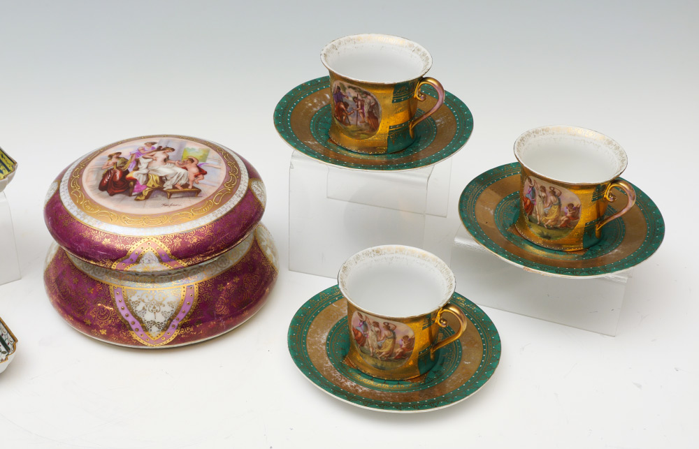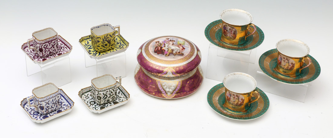 8 PIECE LOT OF ROYAL VIENNA PORCELAIN: An assembled collection of 8 pieces total to include 1-4) 4 rectangular cups and saucers, floral and bird decorated, each of a different color, blue beehive mark, cups 2 1/4'' h. x 2 3/4'', saucers 4 1/2'' x 3 3/4''. 5) Covered dresser jar with illegibly signed neo-classical scene on lid and gilt decoration, marked with blue beehive and Austria, overall 4 1/4'' h. x 6 1/2''. 6-8) 3 cups and saucers with assorted neo-classical scenes, blue beehive mark with Austria. Cups, 2 1/2'' h. x 3 5/8'', saucers 5 7/8''.