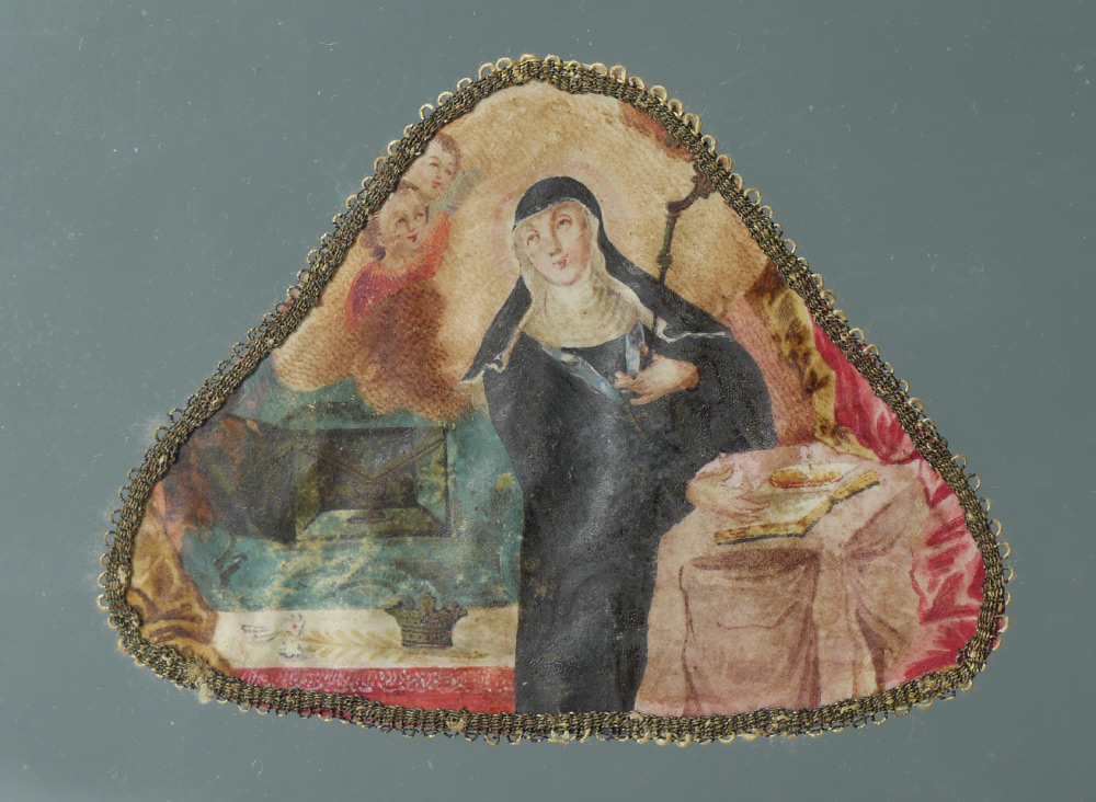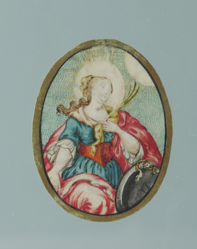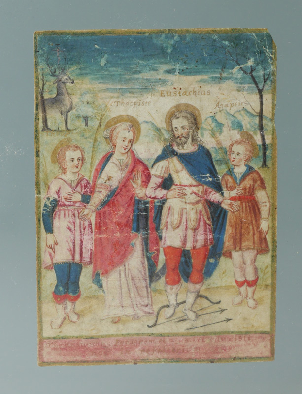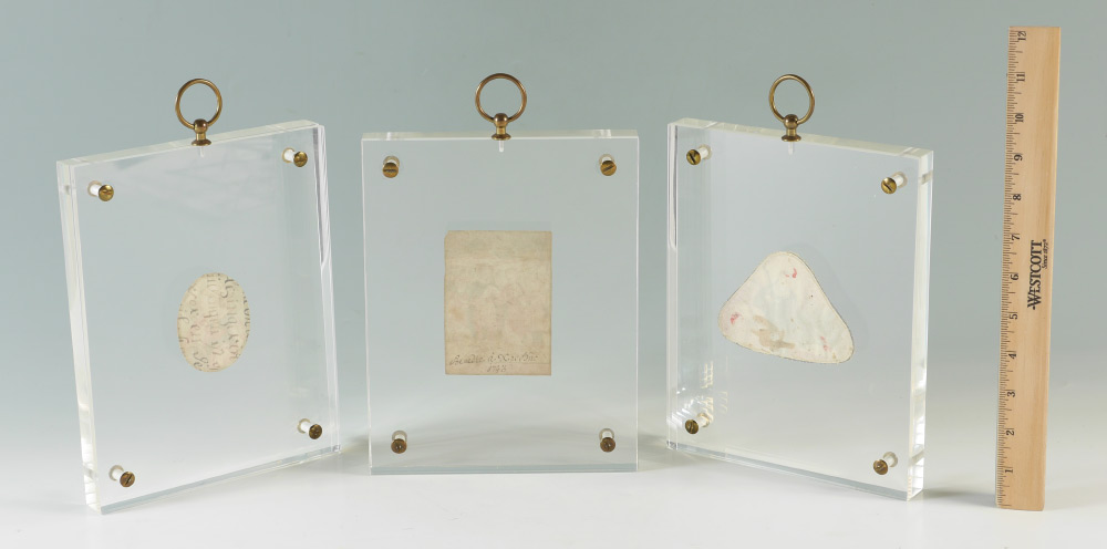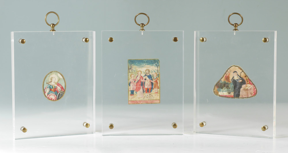 3 LUCITE FRAMED RELIGIOUS PICTURES: 3 small religious scenes encased in Lucite to include 1) Holy Great Martyr Eustathius with his wife St. Theopiste and their children in the iconic hunt scene. Latin writing and dated 1743 on back, approx. 3 3/4'' x 2 3/4''. 2) Portrait on a nun reading scripture with ethereal children, appears to be on leather, 2 3/4'' x 3 3/4''. 3) Portrait of unknown woman, appears to be out of a book with writing on back, 2 1/2'' x 2''. Each Lucite frame measures 10'' x 7'' x 1''.