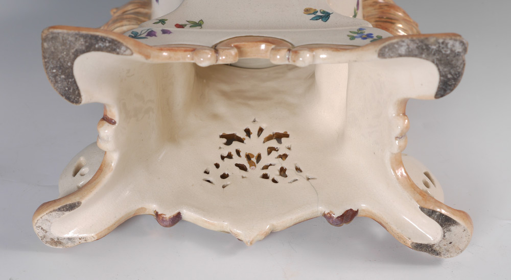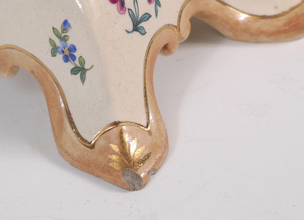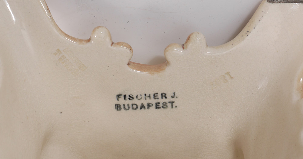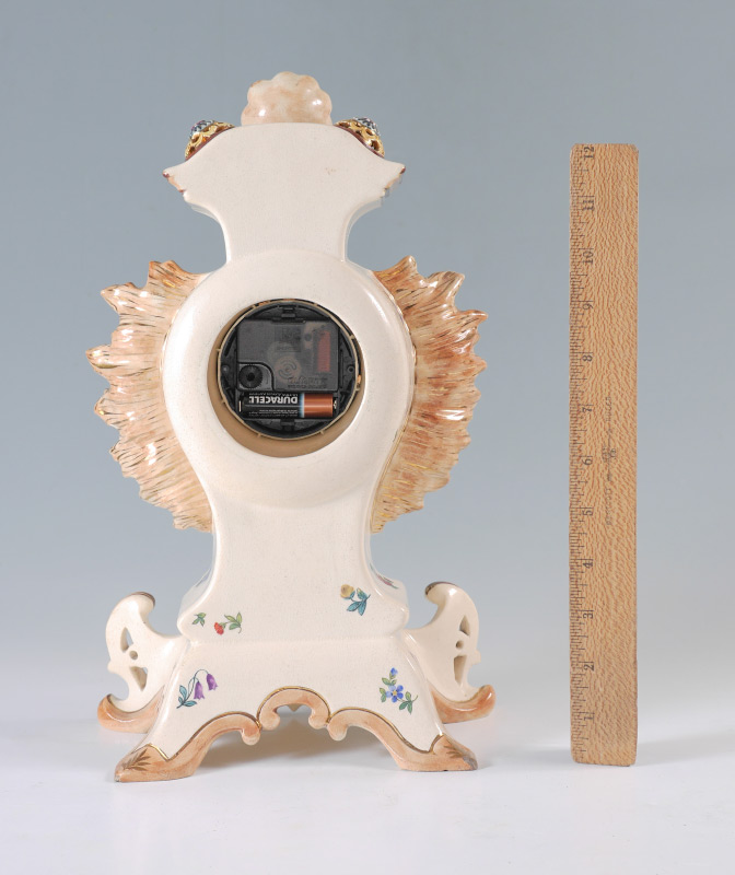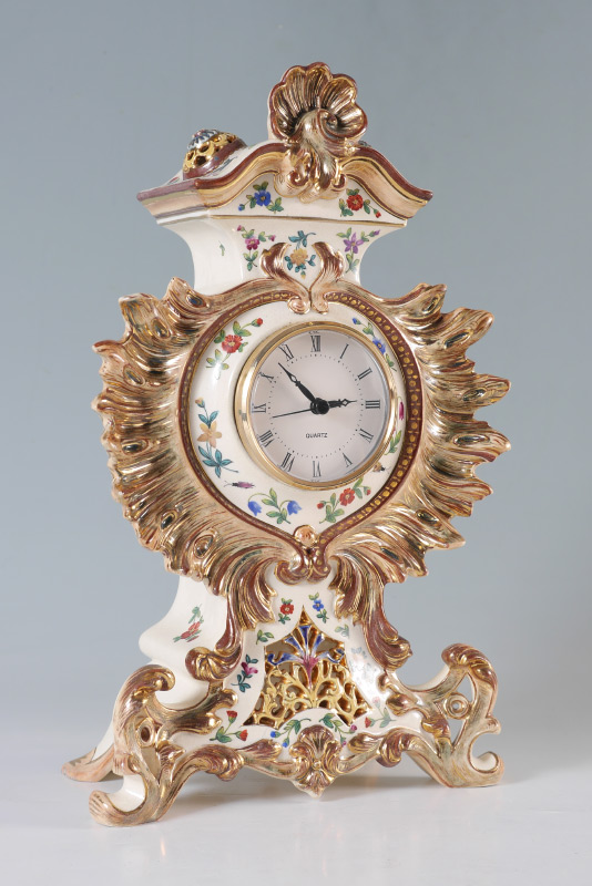 FISCHER J. ZSOLNAY PORCELAIN CASE CLOCK: Rococo style floral and gilt decorated porcelain case, stamp marked Fischer J., Budapest and illegible impressed marks. Replacement quartz movement, 14'' h. x 8 1/2'' x 4''.