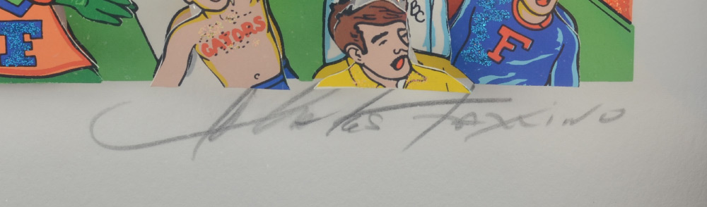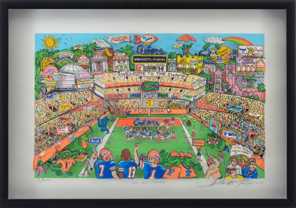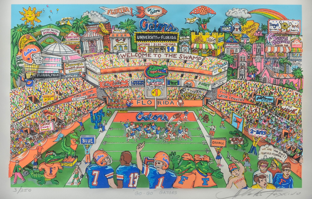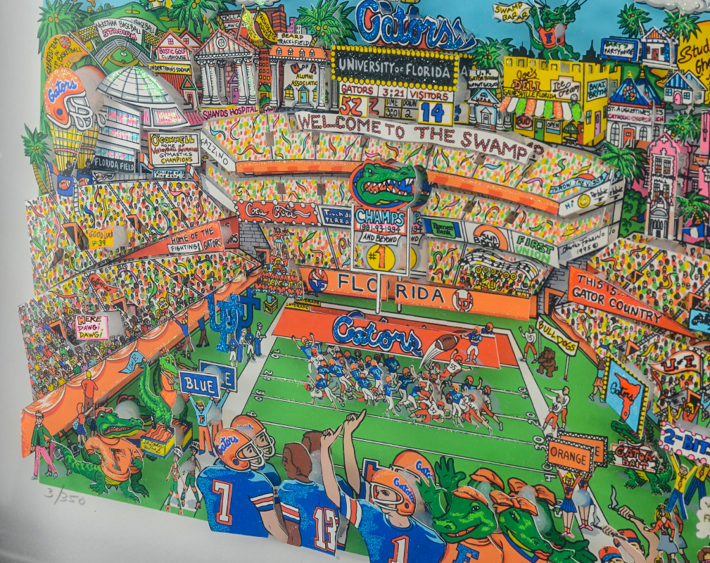 FAZZINO, Charles, (American, 1955-): ''Go Go Gators'', 1995, 3D serigraph, sight size 12.5'' x 18.5'', pencil signed lower right, titled in the margin, numbered 3/350 lower left, contemporary metal frame, 14'' x 19.5''. With over 40 one man exhibits, Fazzino has earned his popularity through his use of detail, exuberance and color.