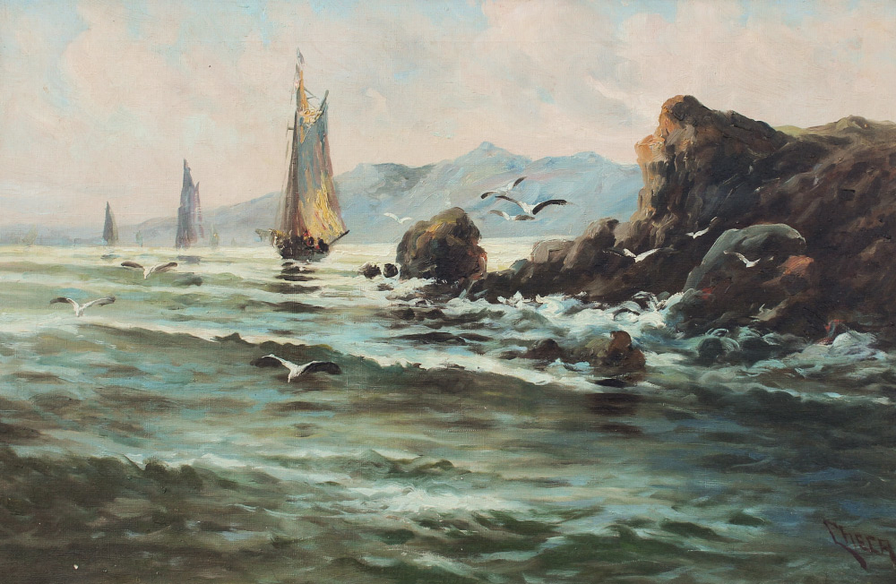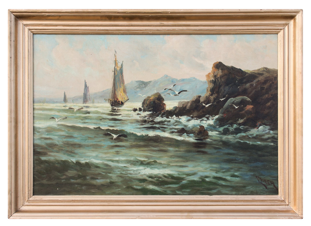 CHECA Y DELICADO, Felipe, (Spanish, 1844-1907): Coastal Scene with Sailboats, Oil/Canvas, 19'' x 29'', signed lower right, painted frame 23.5'' x 33.5''.