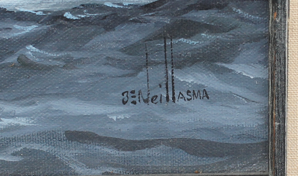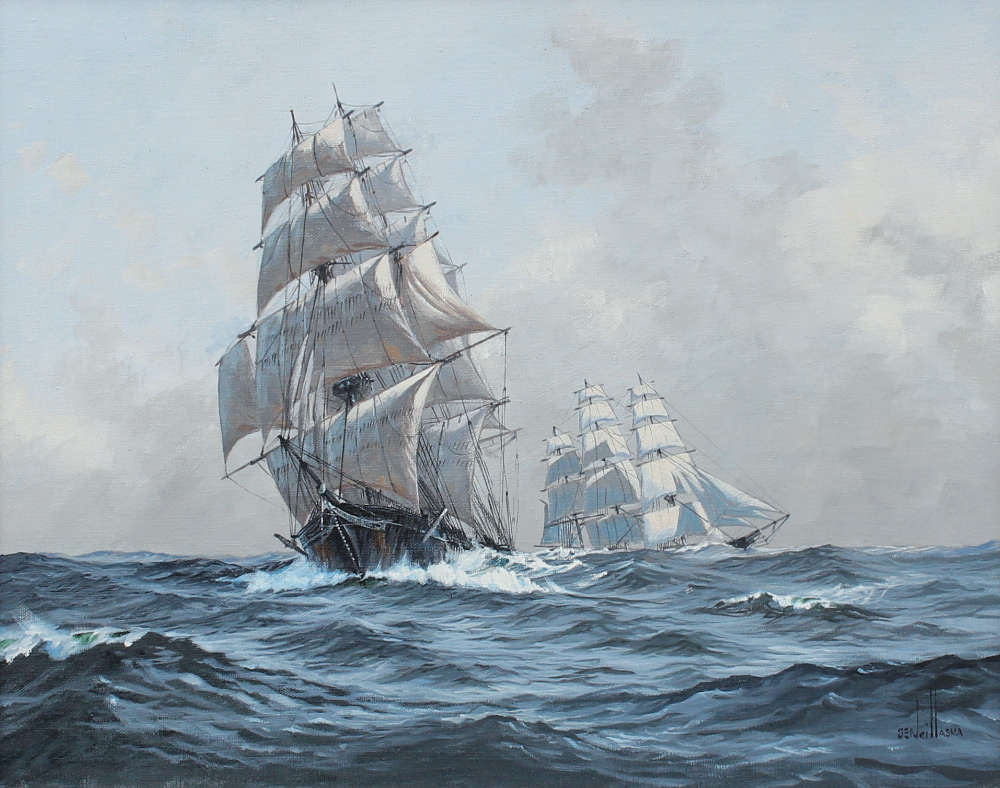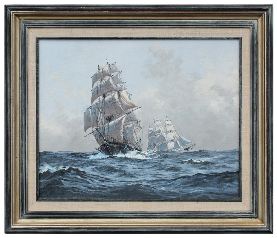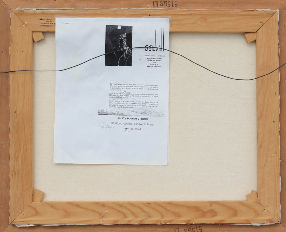 O'NEILL, Ben, (American 20th C.): Clipper Ships, Oil/Canvas, 16'' x 20'', signed lower right, encased in custom frame 22'' x 26.25''. O'Niell currently works out of Sandwich, Massachusetts at the Misty Marsh Studio. He is an active member of the American society of Marine Artists and the Society of Marine Painters. artist works out of sandwich mass in the misty marsh studio, member of American Society of Marine Artists, Society of Marine Painters.