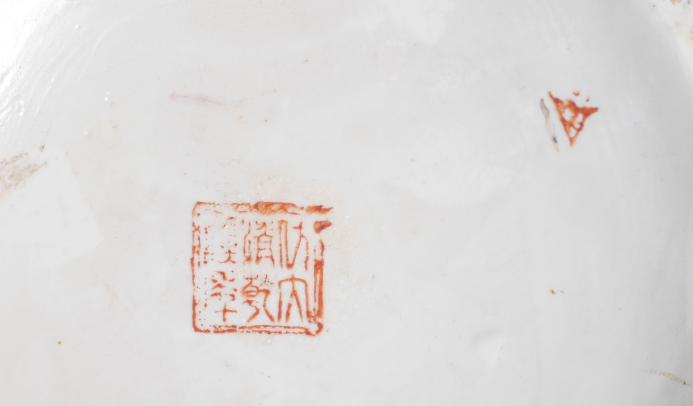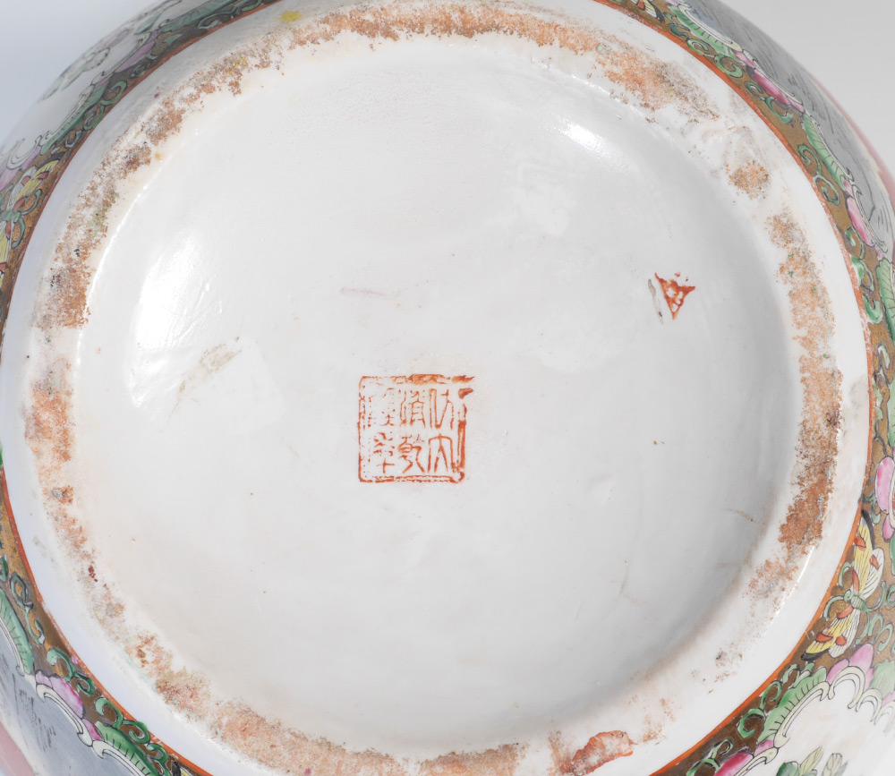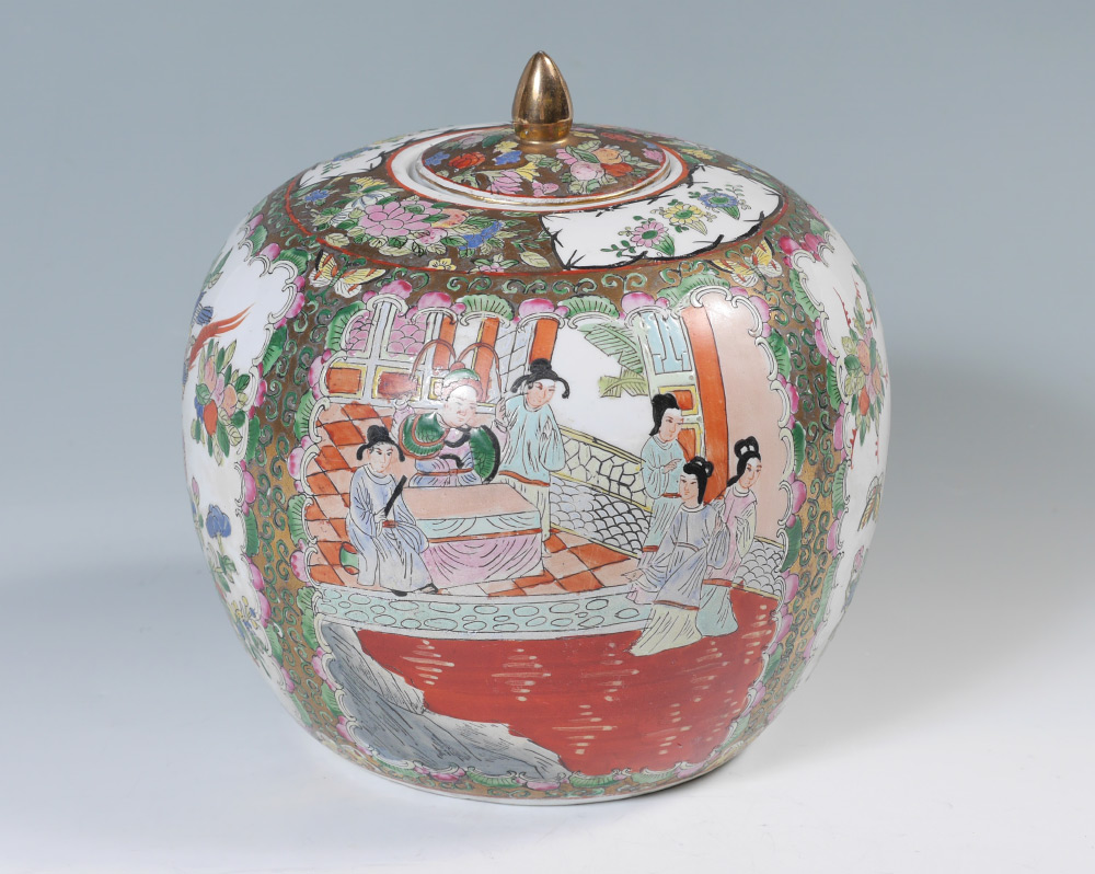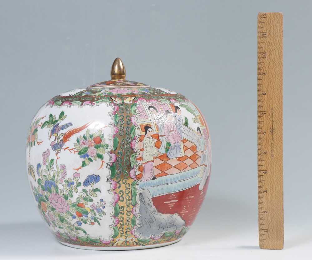 CHINESE ROSE MEDALLION COVERED JAR: Squat ginger jar with panels of floral patterns and genre scenes, spurious red mark on base, overall measures 9 3/4'' h. x 10''.