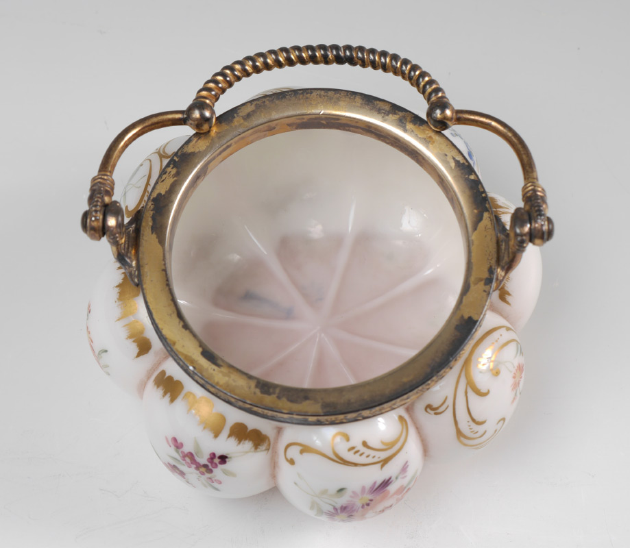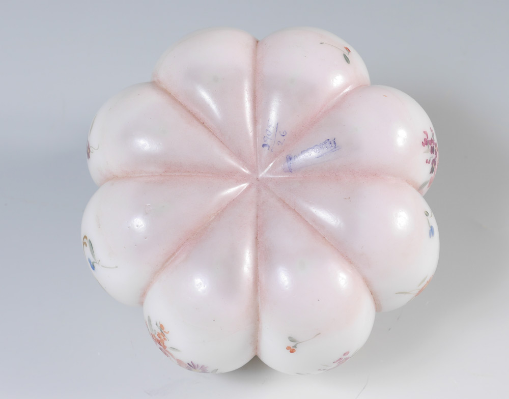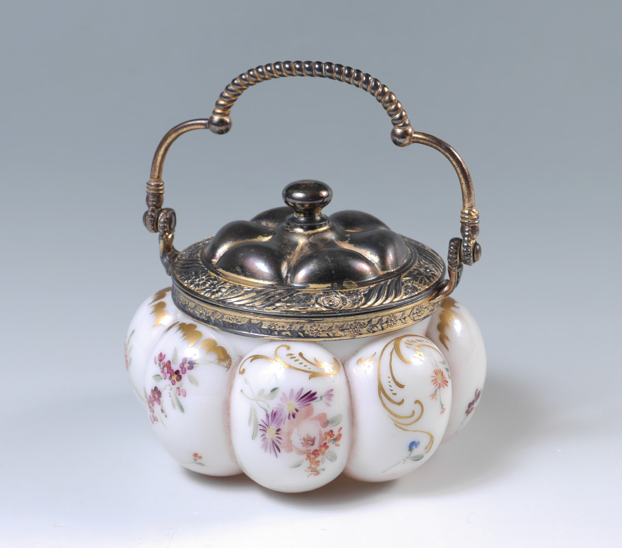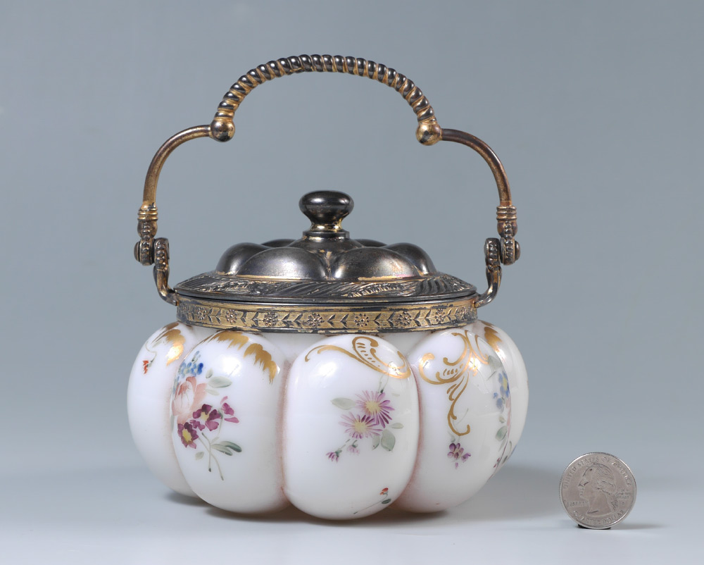PAIRPOINT / MT. WASHINGTON RIBBED BISCUIT JAR: Melon ribbed jar with floral decoration, stamped Pairpoint and numbered 3905/26. Vermeil enhanced metal mount and lid marked with MW and number 4406/a. Measures 4 1/4'' h. x 5 1/4''.