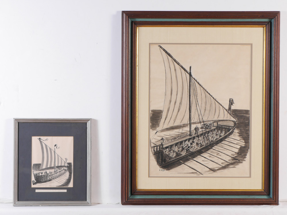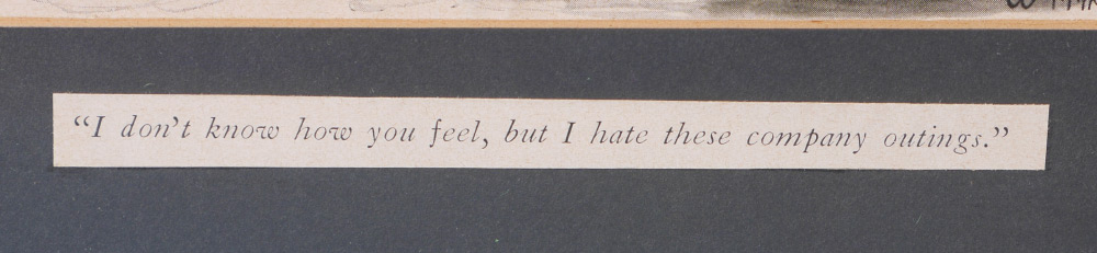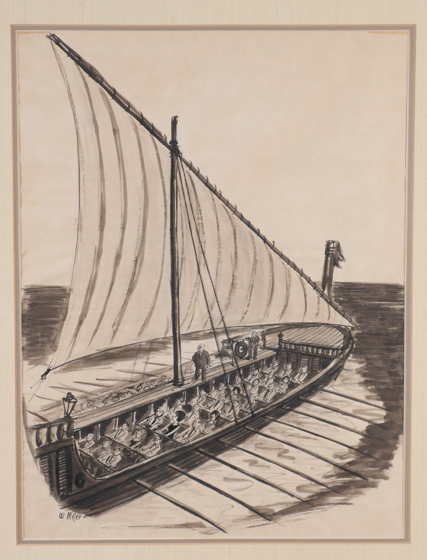 MILLER, Warren, (American, 20th Century): ''Mad Men'' era original watercolor illustration cartoon for the New Yorker featuring a Roman type ship with sail and oars. Caption with the accompanying cartoon from the New Yorker reads ''I don't know how you feel, but I hate these company outings''. There are some slight variances from this artwork and the actual one in the New Yorker, this may be an alternate version or a study for the one used for the New Yorker. Sight size for original measures 22 1/2'' x 17'', framed 33 1/4'' x 17''. Cartoon from the magazine framed measures 15'' x 13 1/2''.