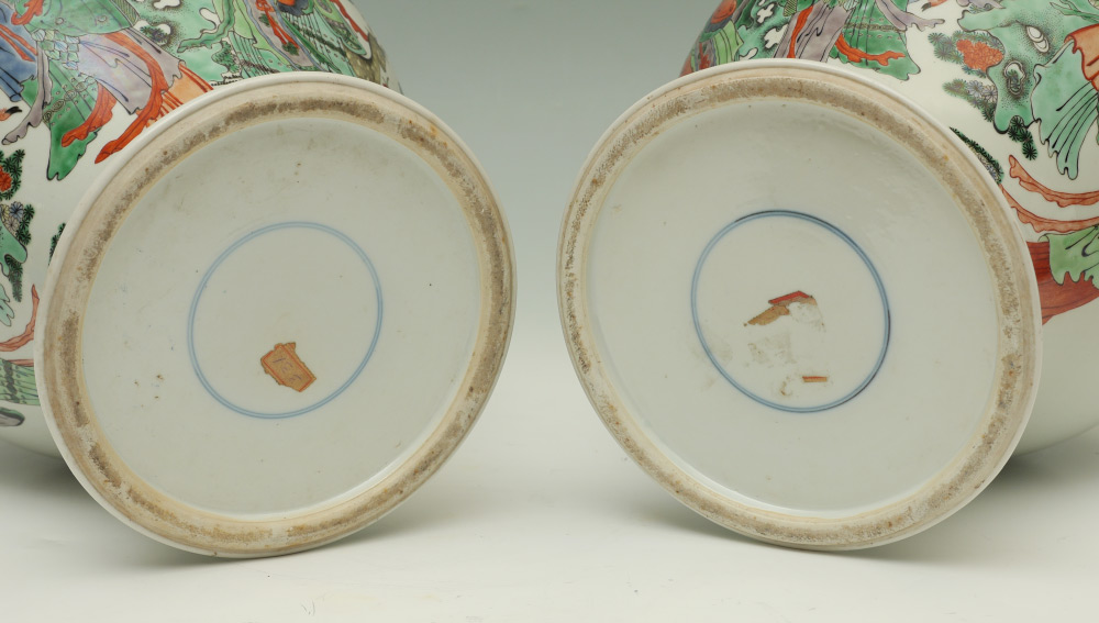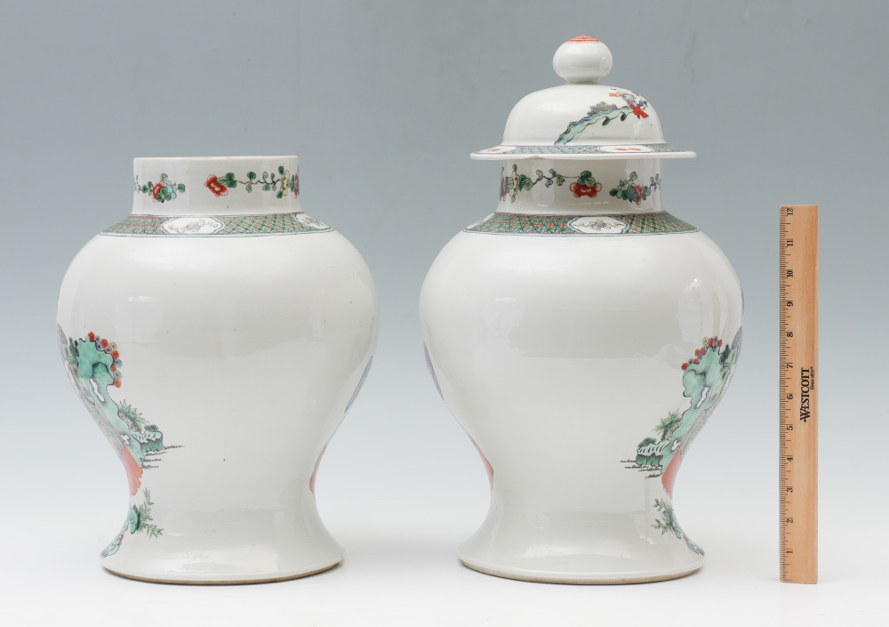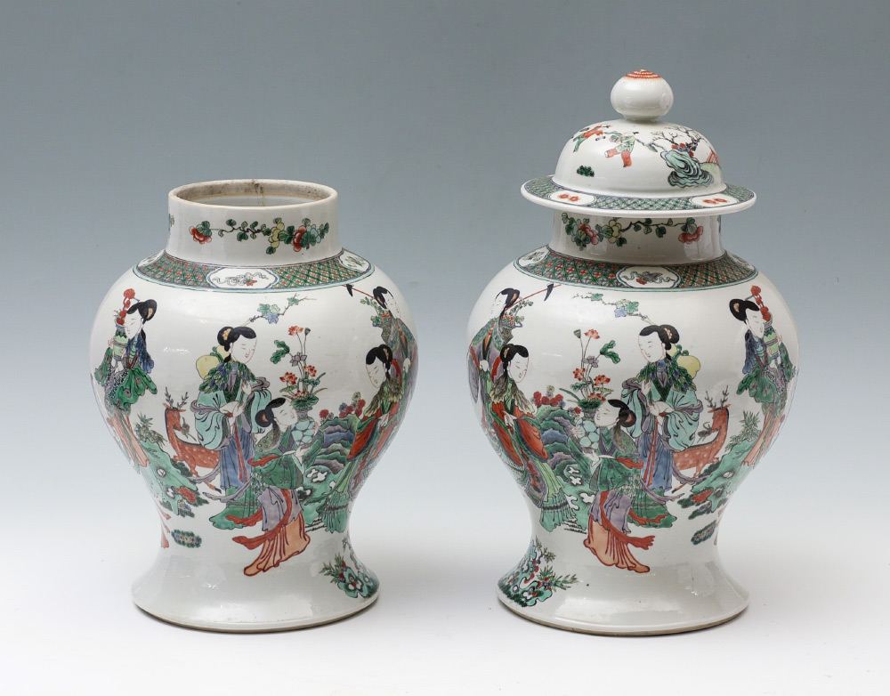 PAIR OF CHINESE GINGER JARS: Polychrome decorated earthenware ginger jars with genre scenes of maidens. Unmarked, overall measures 17 3/4'' h. x 10'' including lid on one.