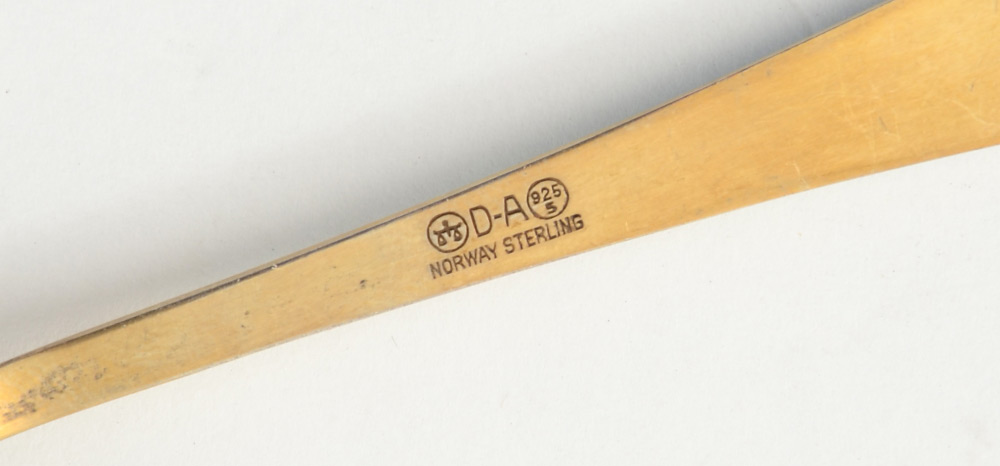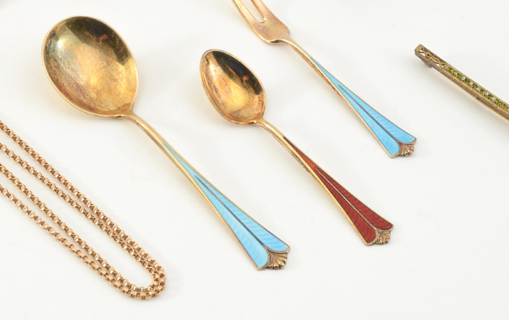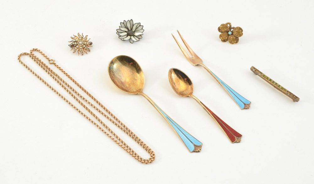 ESTATE JEWELRY & SILVER LOT: Featuring David Andersen enameled sterling daisy brooch and three pieces of enameled vermeil sterling flatware. Also, an adorable four leaf clover pendant/brooch/watch pin, marked Gold on clasp, tests 18k but no promises, 2 grams. 10k Gold (tested) star brooch/pendant set with seed pearls, unknown bar pin and 28'' (tested) 14k gold chain, 14.3 grams. Sold as a lot.