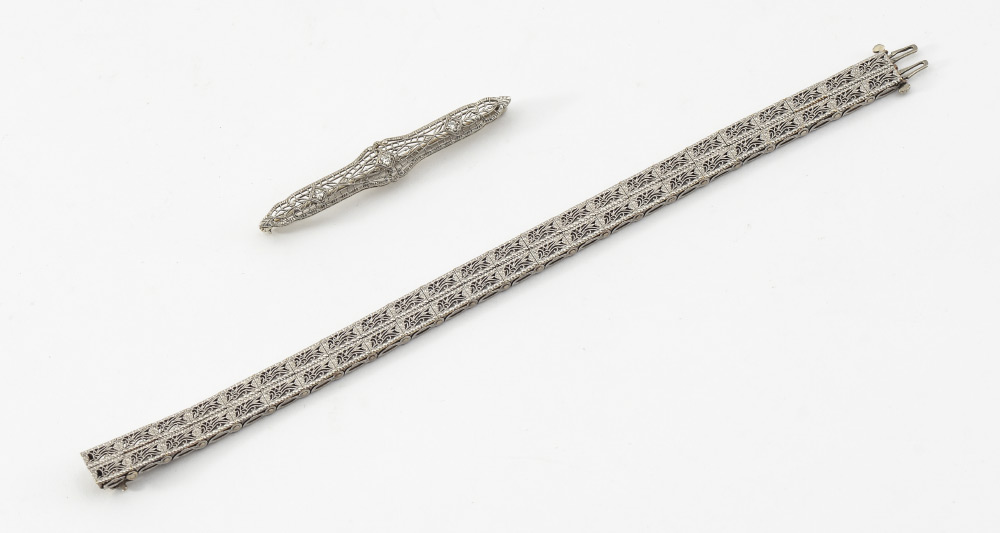 ESTATE 14K WHITE GOLD FILIGREE JEWELRY: 1) 7'' double wide filigree bracelet, dual pressure clasp marked 14k, with hidden safety missing one prong, 20.6 grams. 2) Bar pin set with three small diamonds, 2.25''l., 3.5 grams inclusive. Sold as a lot.