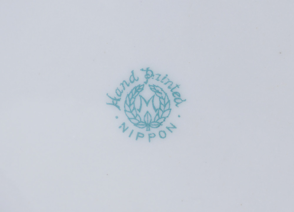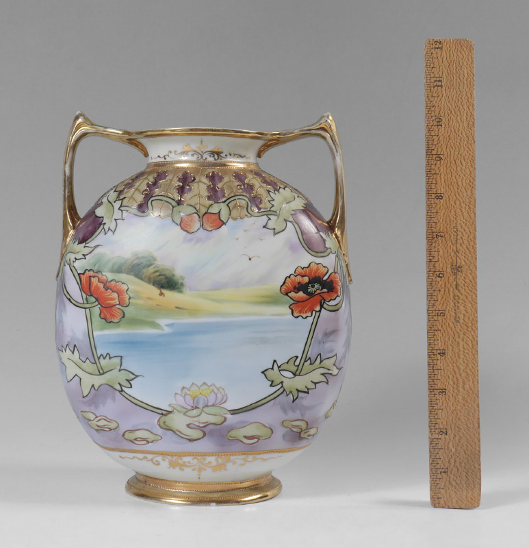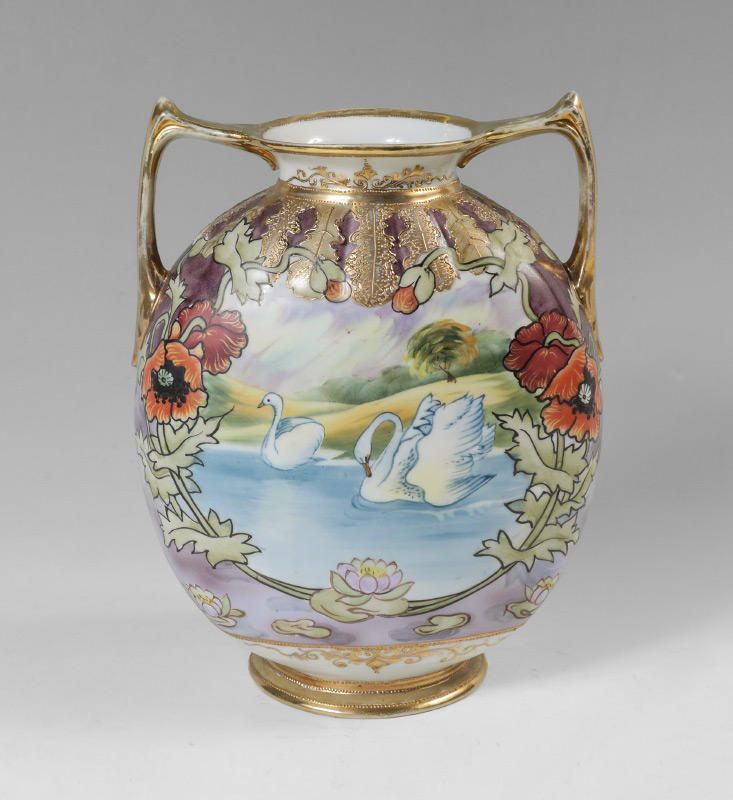 JAPANESE MORIMURA HAND PAINTED NIPPON VASE: Hand painted double handled vase with swan and pond decoration in panels, framed with foliate motifs. Blue Morimura wreath mark, overall measures 10 1/4'' h. x 7 3/4''.