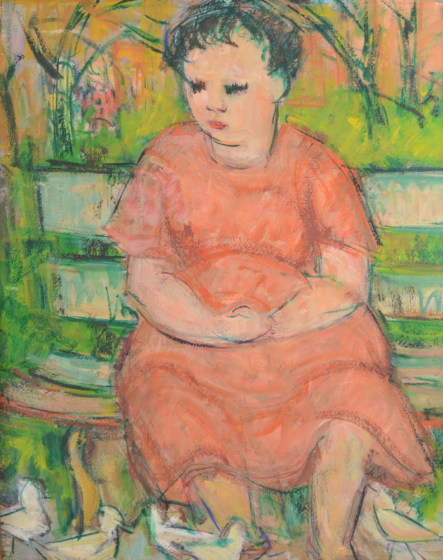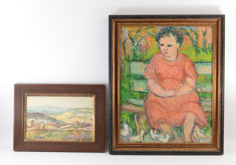 BLUE, Rose Jacobson, (American, 1891-1987): 2 Piece Lot to Include: 1) Woman feeding birds, Oil/Paper, 21.5'' x 17'', framed, 25 1/8'' x 20.75''. 2) Panoramic Countryside Landscape, Watercolor, sight size 7.5'' x 12.25'', framed 12.25'' x 17'', no glass.