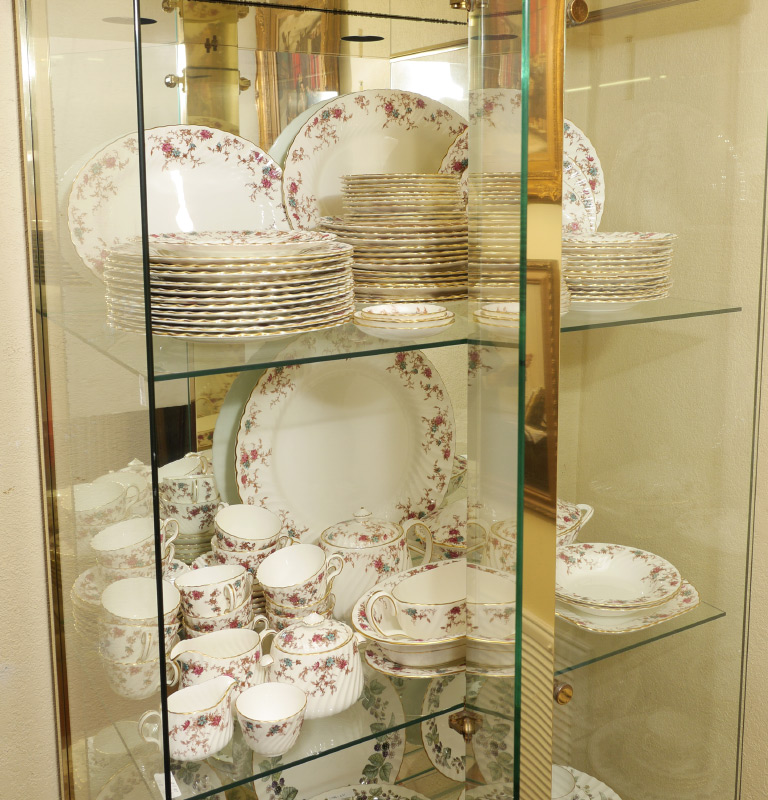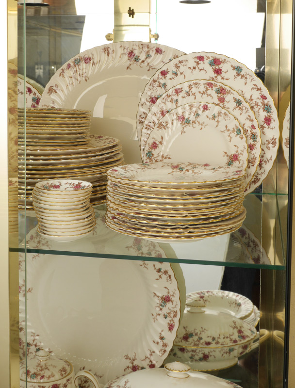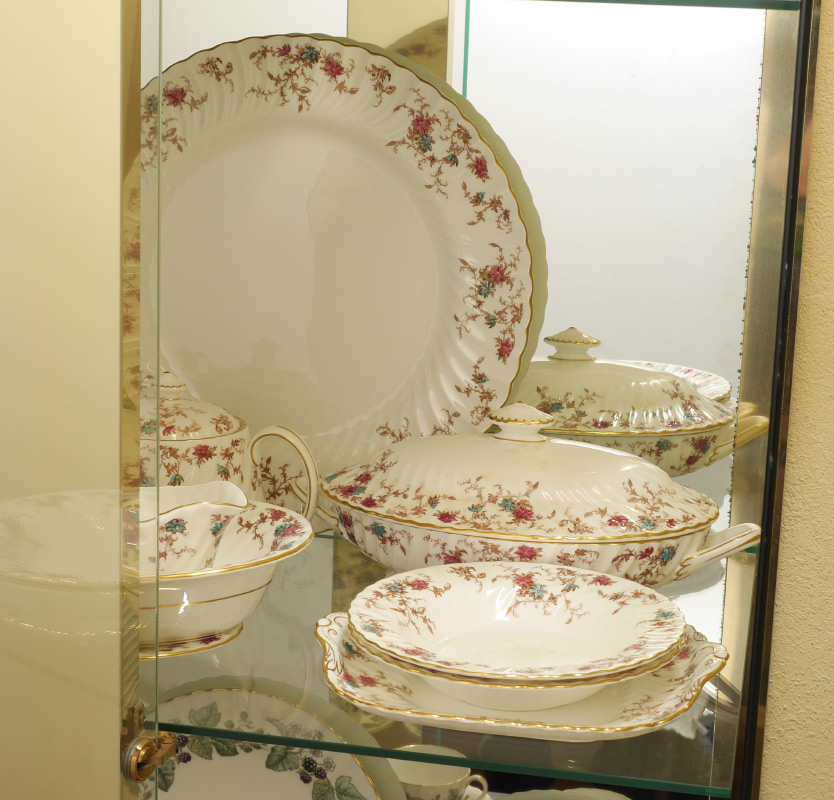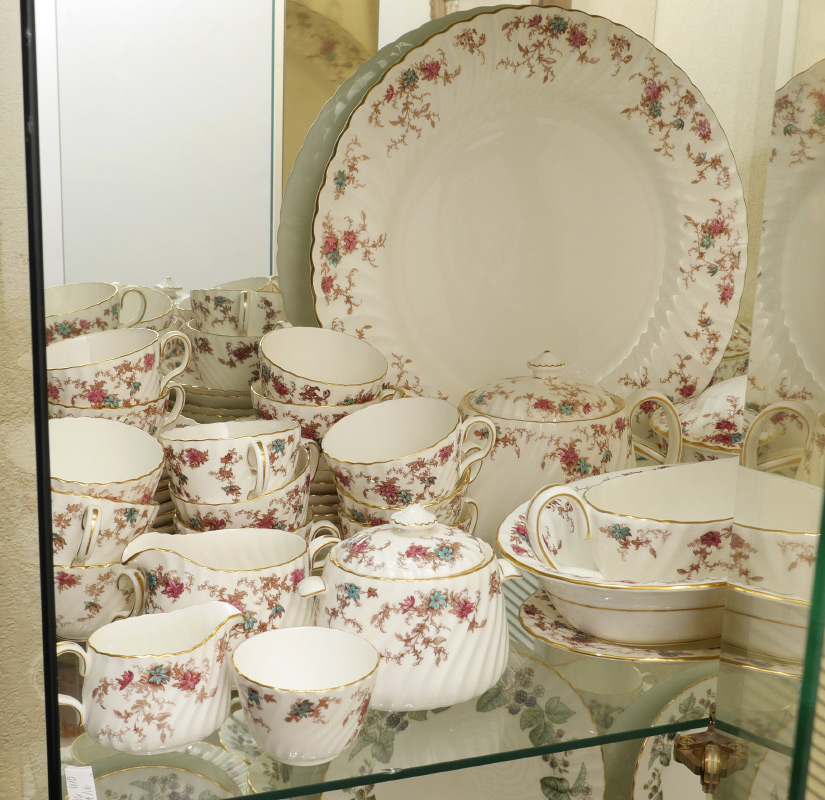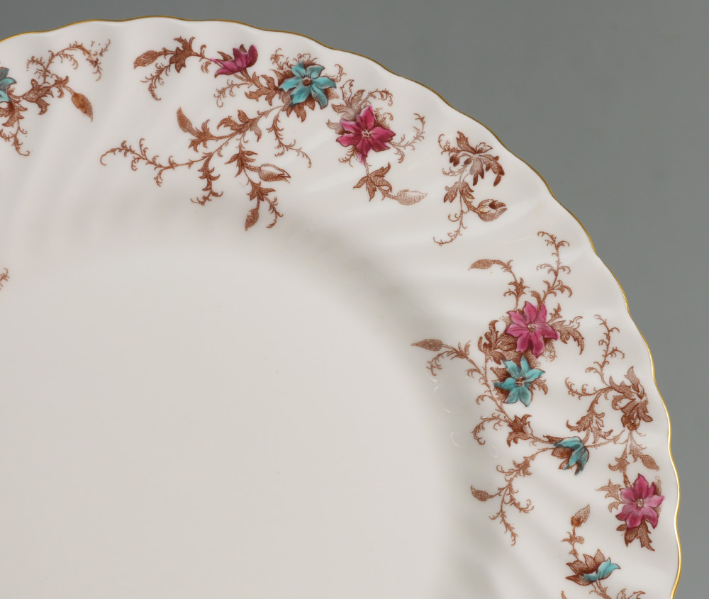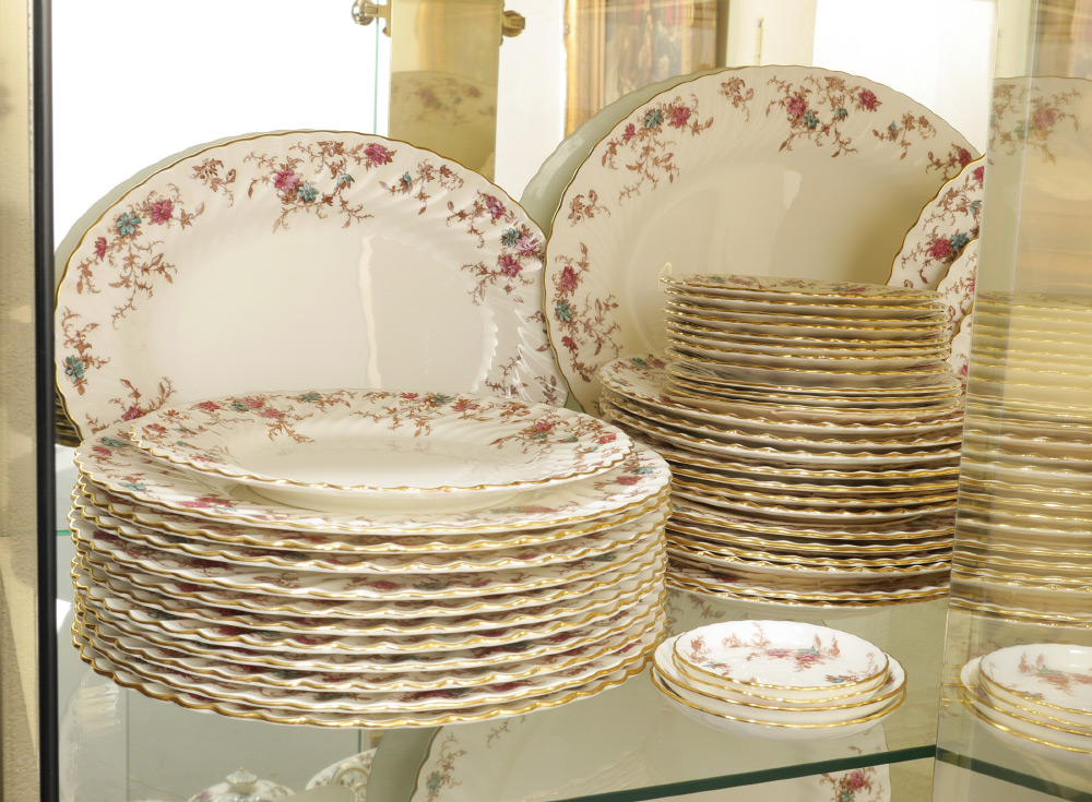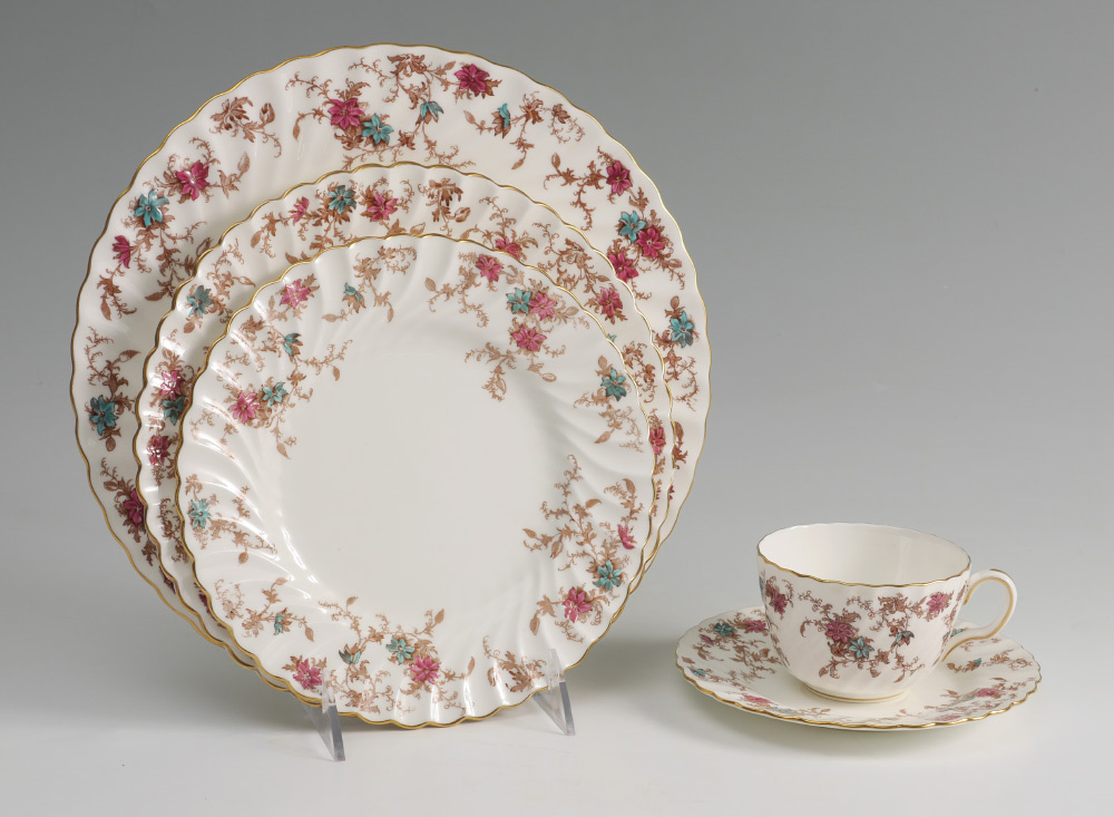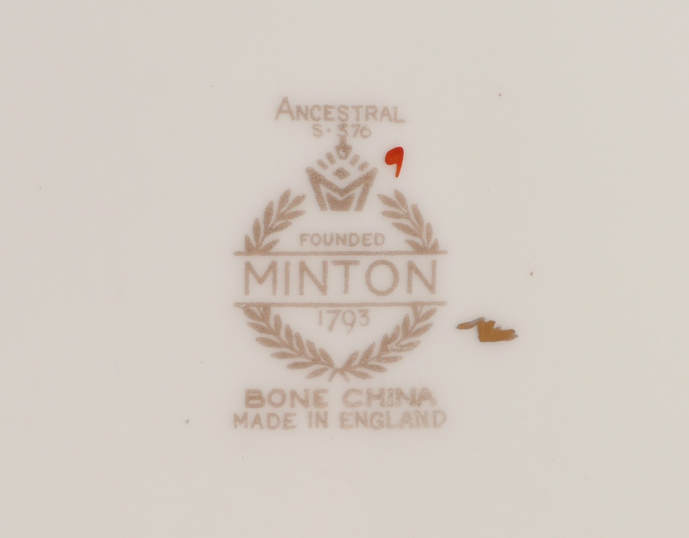 MINTON ANCESTRAL PATTERN CHINA DINNER SERVICE: Approx. 106 pieces in the Ancestral pattern by Minton to include 12 dinner plates (10 5/8''), 12 salad plates (7 7/8''), 14 luncheon plates, 11 bread plates, 2 soup bowls (7 7/8''), 13 jumbo tea cups, 14 saucers, oval covered vegetable, gravy boat with underplate, mini cream & sugar, regular cream (2 3/4'') & sugar (3 1/4''), teapot with lid (3 7/8'' h.), 13 butter pats, cake platter (10''), 2 oval serving platters (largest 15 1/4''), 2 open jams, 2 coasters (3 5/8''), open vegetable (10'').
