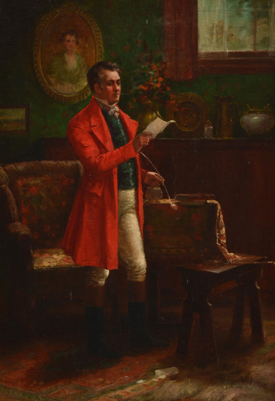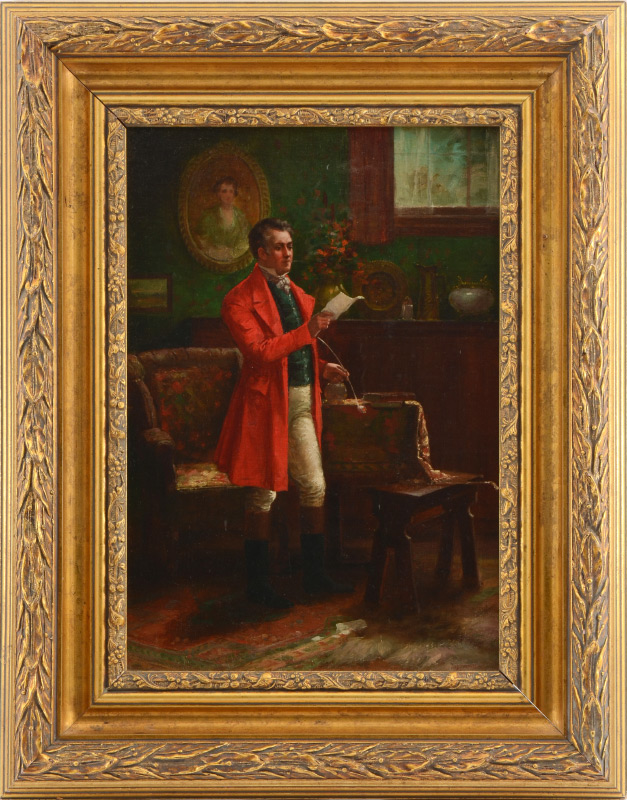 ILLEGIBLY SIGNED CONTINENTAL PAINTING OF GENTLEMAN IN INTERIOR: Oil/Canvas laid down on metal, signed lower right, 14'' x 10'', framed, 20'' x 15.5''.