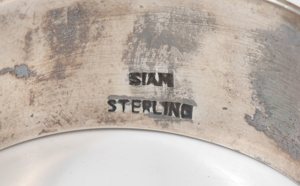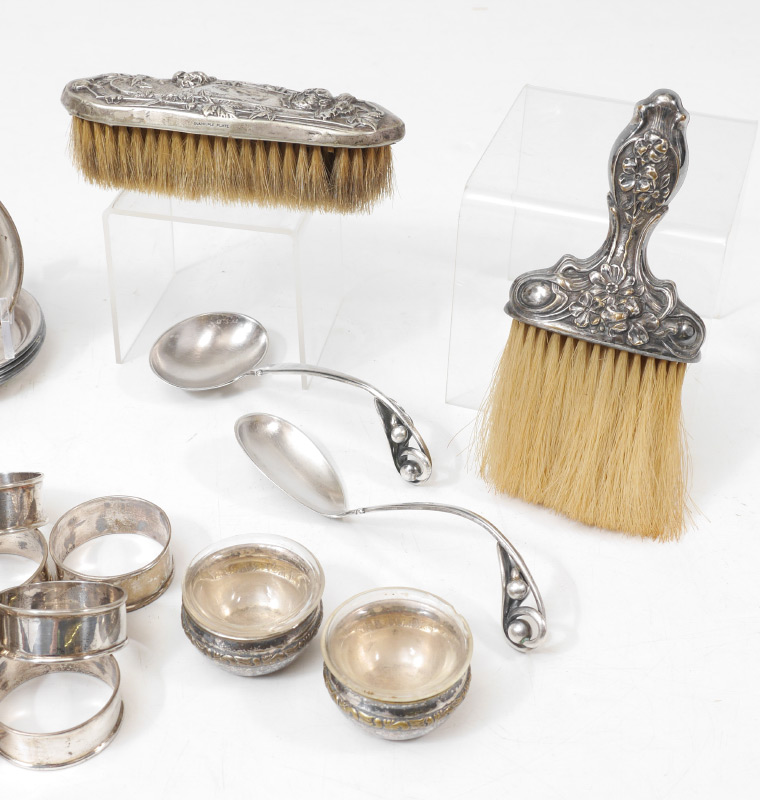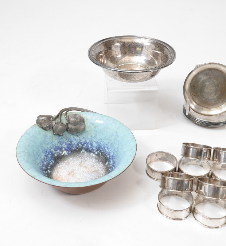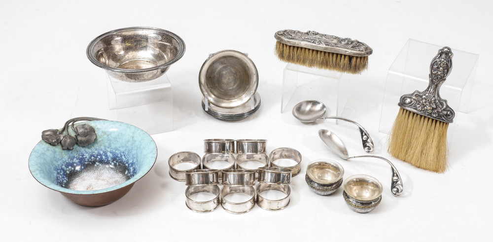 ESTATE COLLECTION OF STERLING ITEMS: An assembled collection to include 12 napkin rings, Manchester bowl, 2 Sorenson Danish ladles. Sold with 2 silverplate brushes, nut dishes, salt cellars and a Nekrassoff enamel on copper bowl. Approx. 9.0 troy oz.