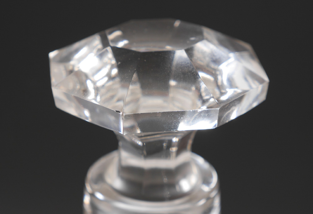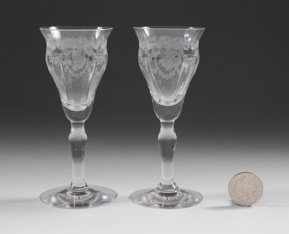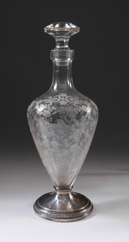 SILVER MOUNTED ETCHED GLASS DECANTER SET: 10 pieces total with etched floral motif to include 1) Decanter with Sheffield Silver Co. sterling mounted foot, faceted stopper, 12 1/4'' h. x 4''. 2-10) 9 cordial stems with foliate swag design, 4 3/4'' h.
