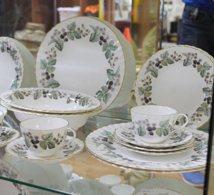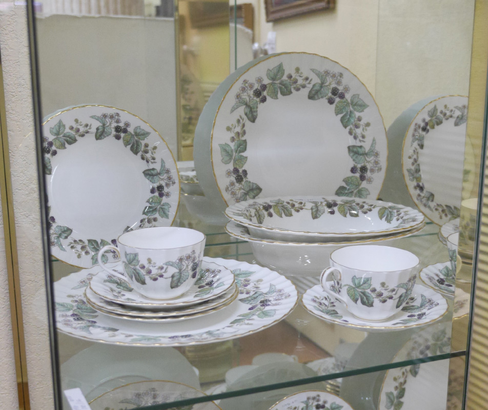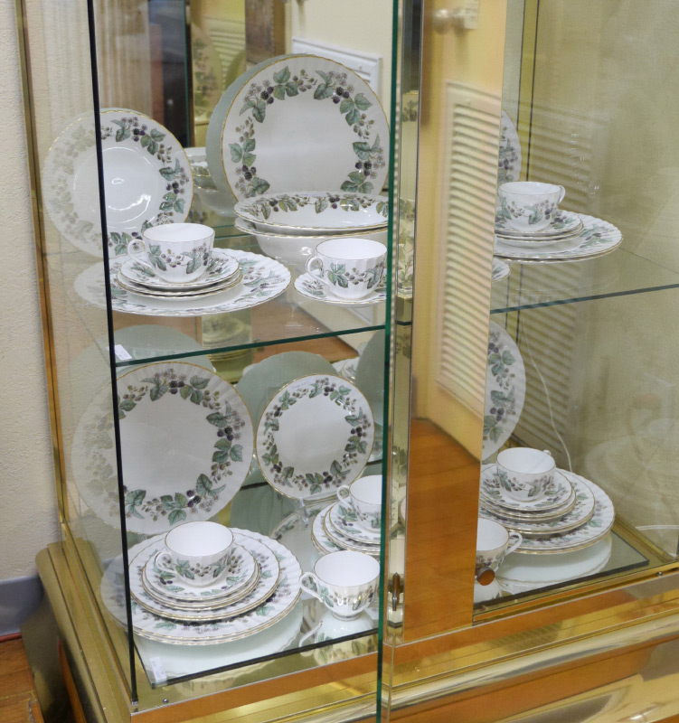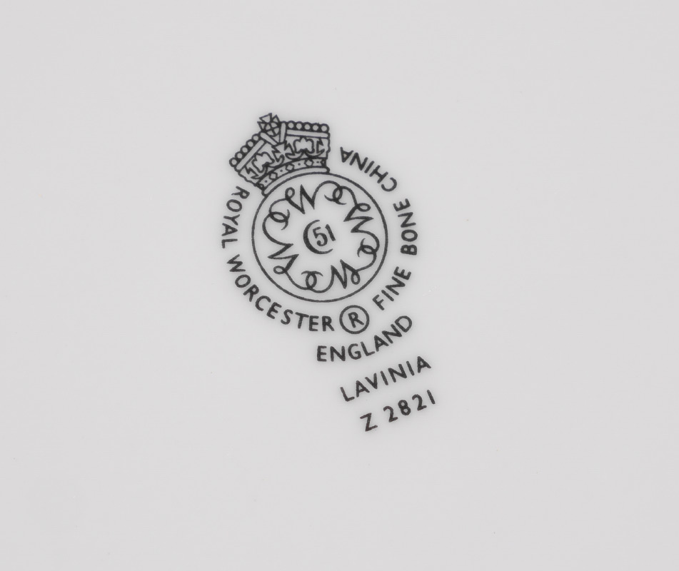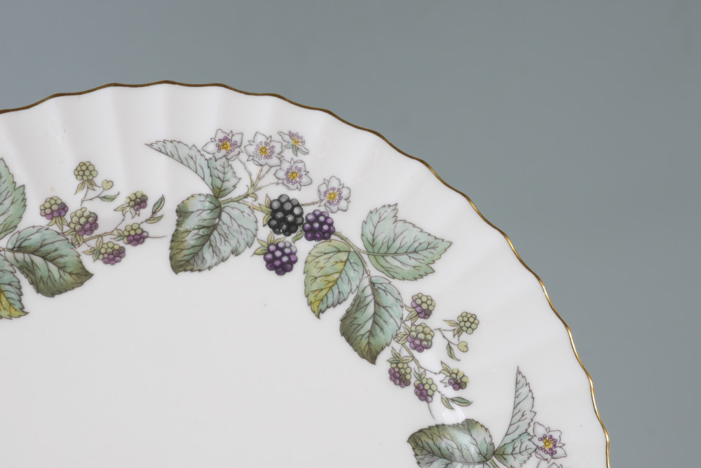 ROYAL WORCHESTER LAVINIA CHINA DINNER SERVICE: Approx. 48 pieces in the Lavinia pattern by Royal Worcester with berries vines rim to include 10 plates (10 1/2''), 10 salad plates, 10 bread plates, 9 tea cups, 7 saucers, 2 open vegetables.