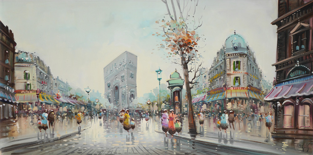 DEVITY, Antonio, (Italian, 1901-): Parisian Street Scene at the Ark of Triumph, 23.75'' x 48'', signed lower right, artist stencil verso, unframed.