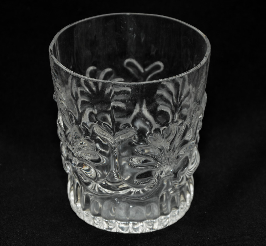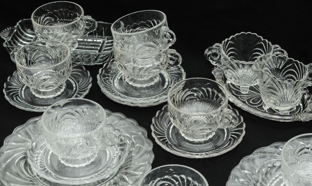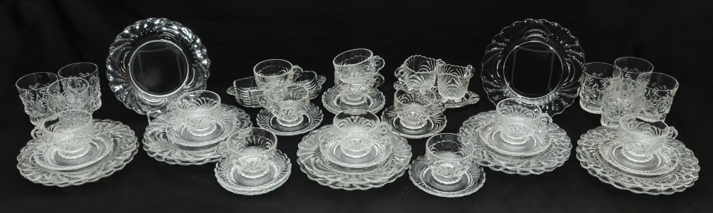 CAMBRIDGE CAPRI GLASSWARE LUNCHEON SET: Approx. 47 piece in the Capri pattern by Cambridge to include 12 plates (8 1/2''), 12 teacups (2 3/8'' h.), 12 saucers (5 1/2''), 7 tumblers (3 1/2''), open creamer and sugar with tray, condiment tray.