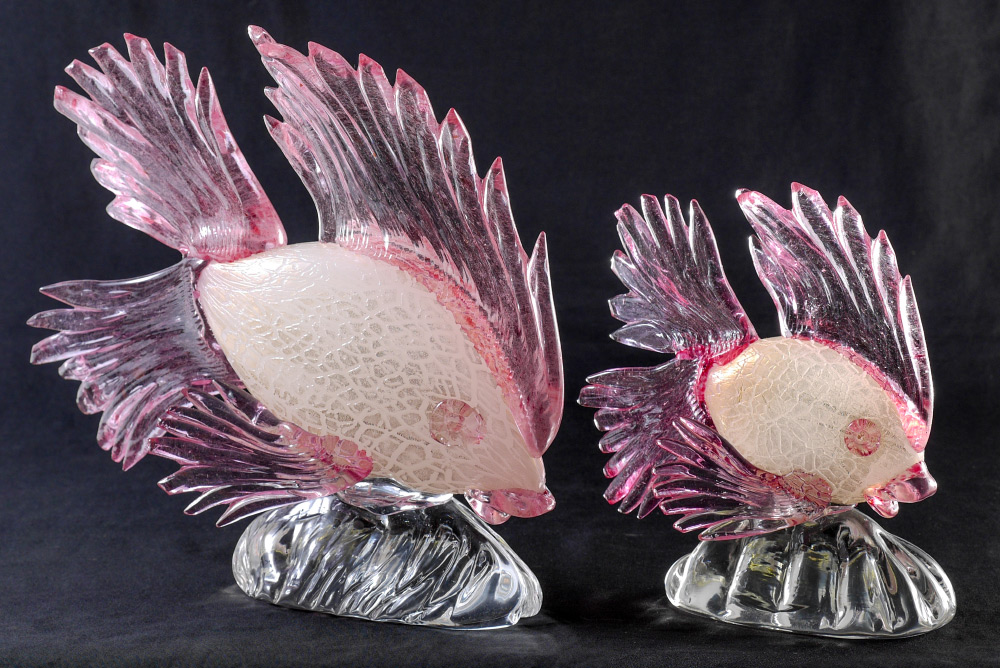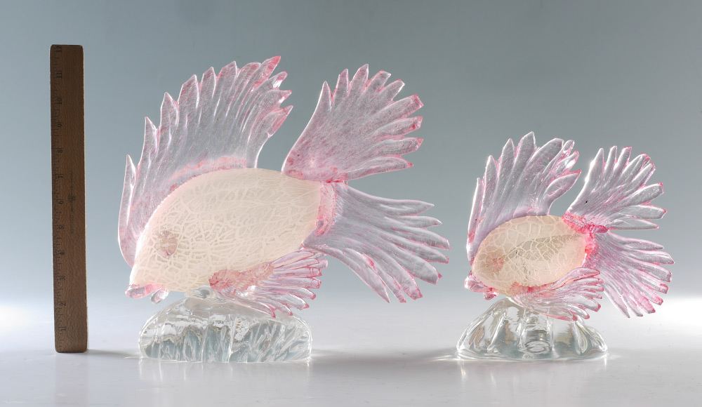 PAIR OF MURANO GLASS FISH: One larger than the other, pink ruffled fins on textured white bodies, molded clear base. No visible signature or labels. Tallest 12'' h. x 13'' x 5 1/4''. CONDITION: Base of larger piece has chipped rough edge on one side.