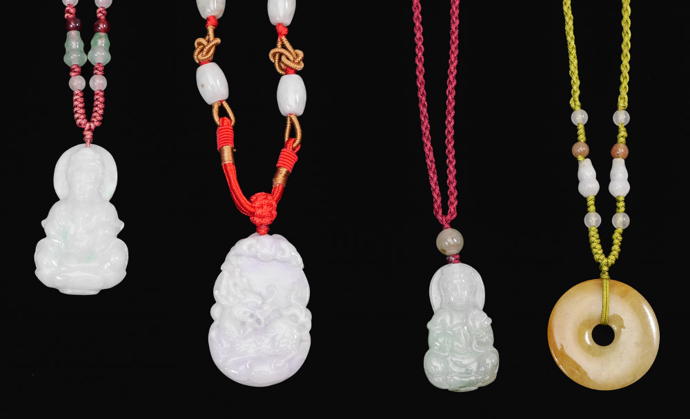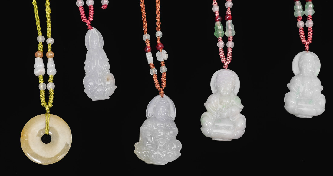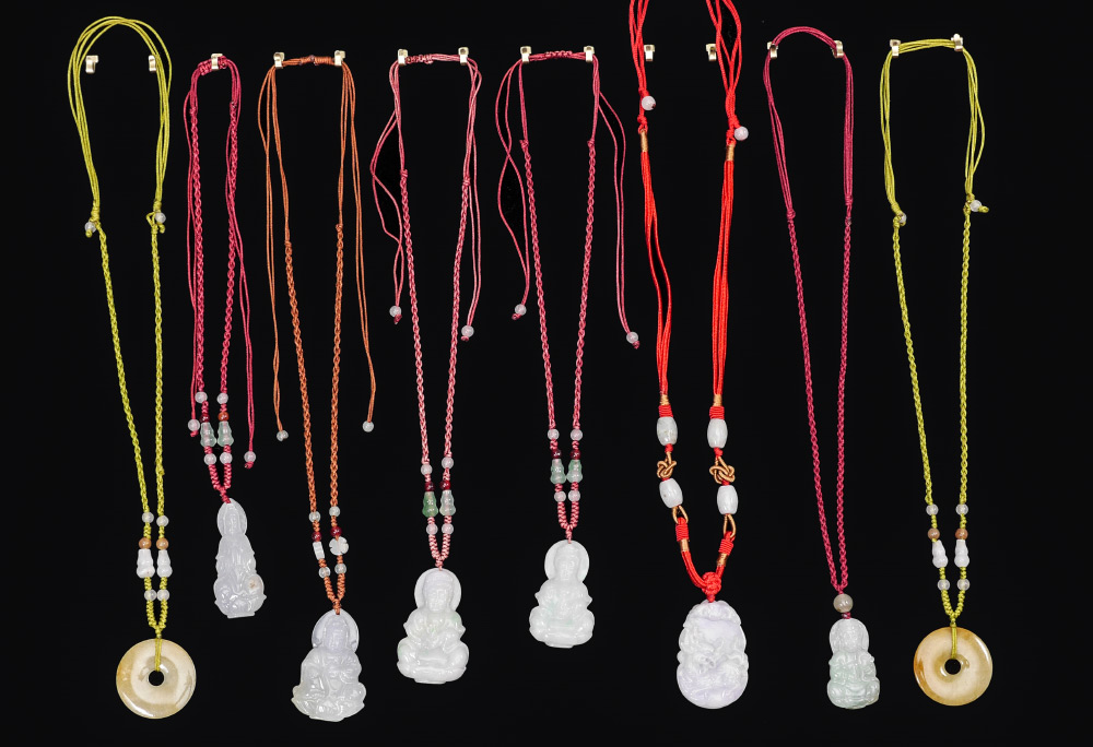 8 PIECE JADE OR STONE PENDANT NECKLACES: 8 pieces total, each from jade or similar stone, 6 figural pendants, 2 round. Each with string necklaces with beads. Largest pendant 1 3/4'', longest overall with necklace 12''.