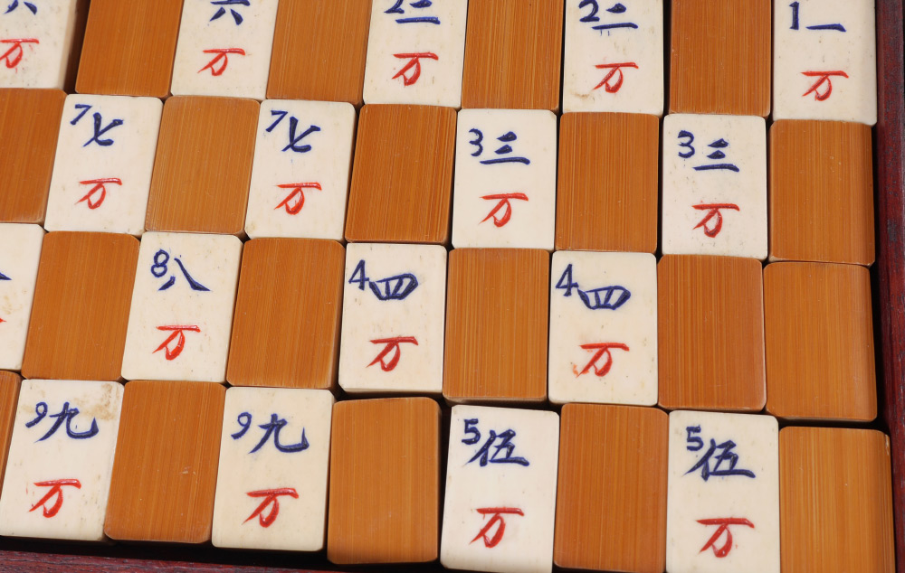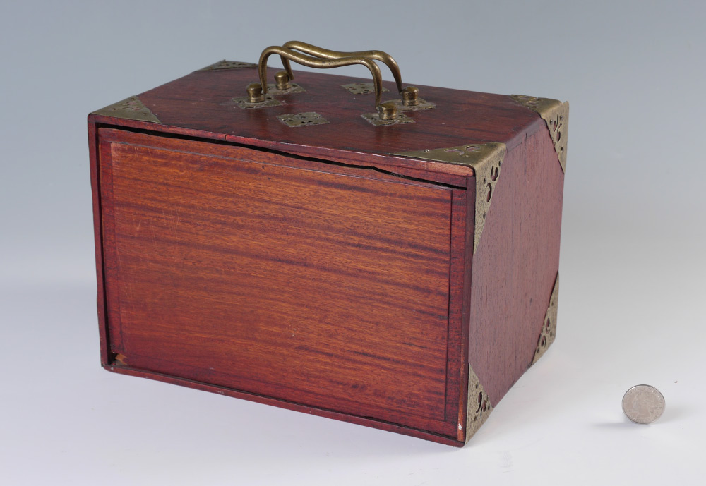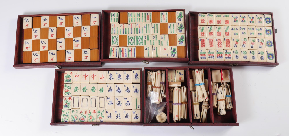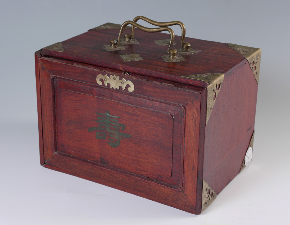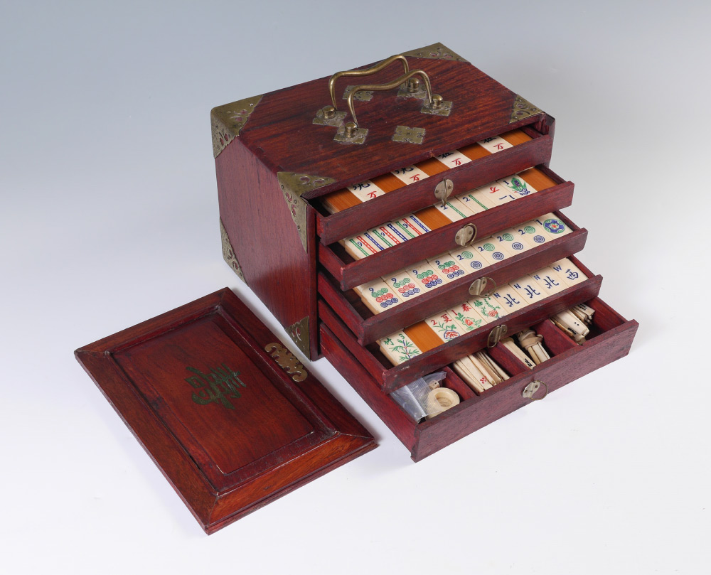 BONE MAHJONG SET IN ROSEWOOD BOX: Appears to be a complete set of Mahjong tiles and sticks in rosewood box with brass trim and decoration, 5 drawers. Box overall measures 7 1/4'' h. x 9 1/2'' x 6 1/2''.