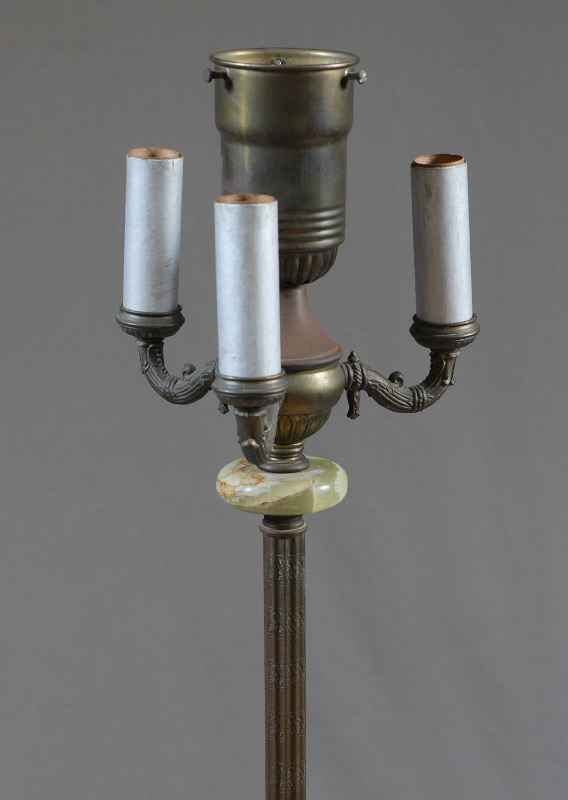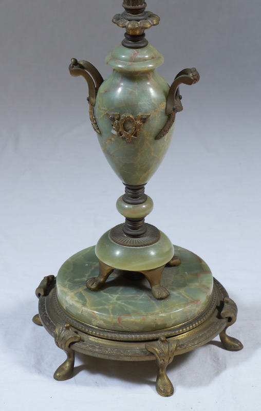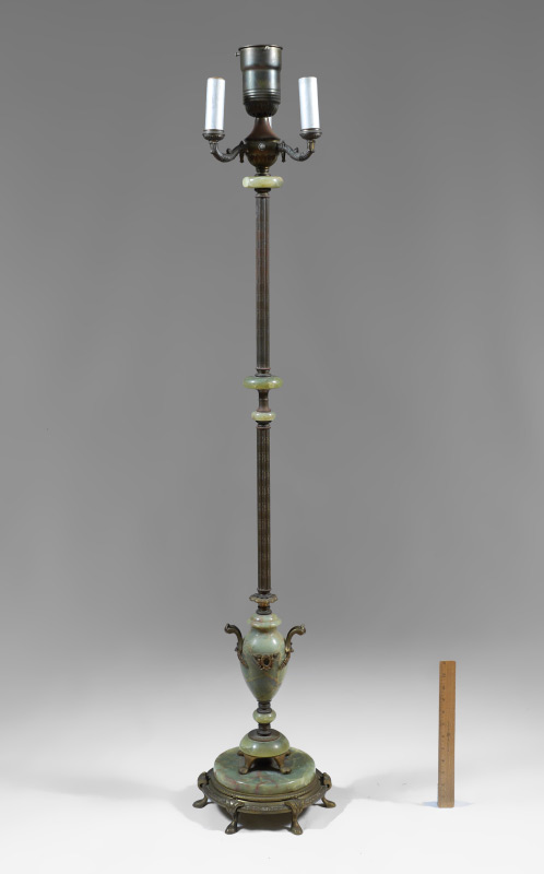 ONYX & BRASS FLOOR LAMP: Embossed brass shaft with green onyx accents, base with green onyx urn, applied cast metal decoration. 4 socket fixture, no shade. Overall 57 3/4'' h. x 10 3/4''.