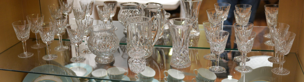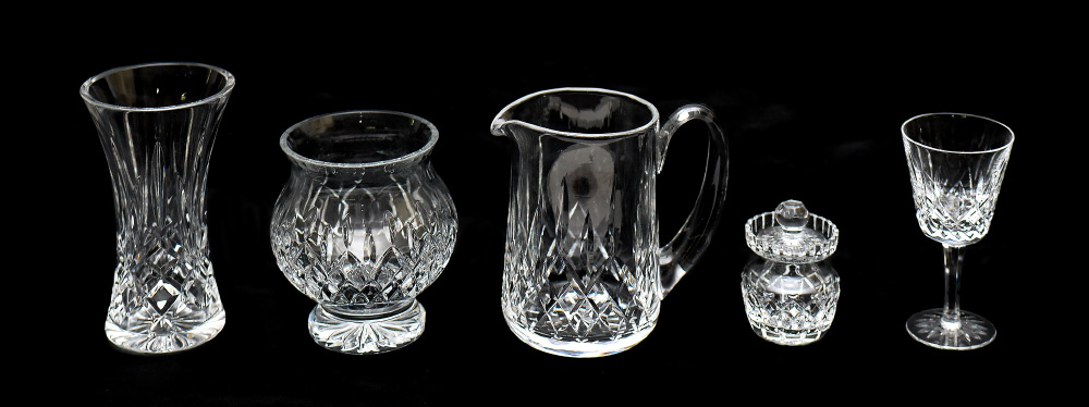 15 PIECE WATERFORD CRYSTAL: 16 pieces total, 15 Waterford to include 12 Lismore claret wines (5 7/8''), Lismore jug (6 1/2''), vase and covered jar of other patterns. Sold with a bulbous vase, not Waterford.