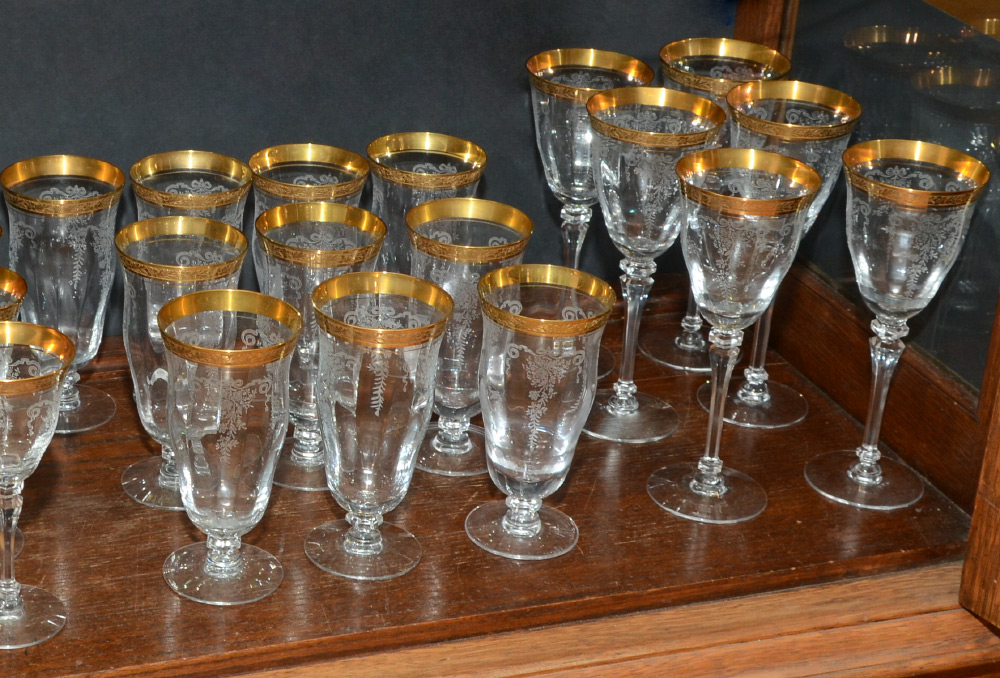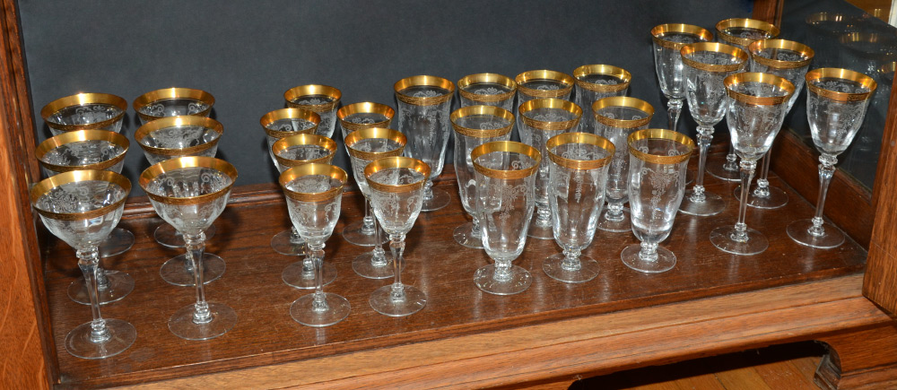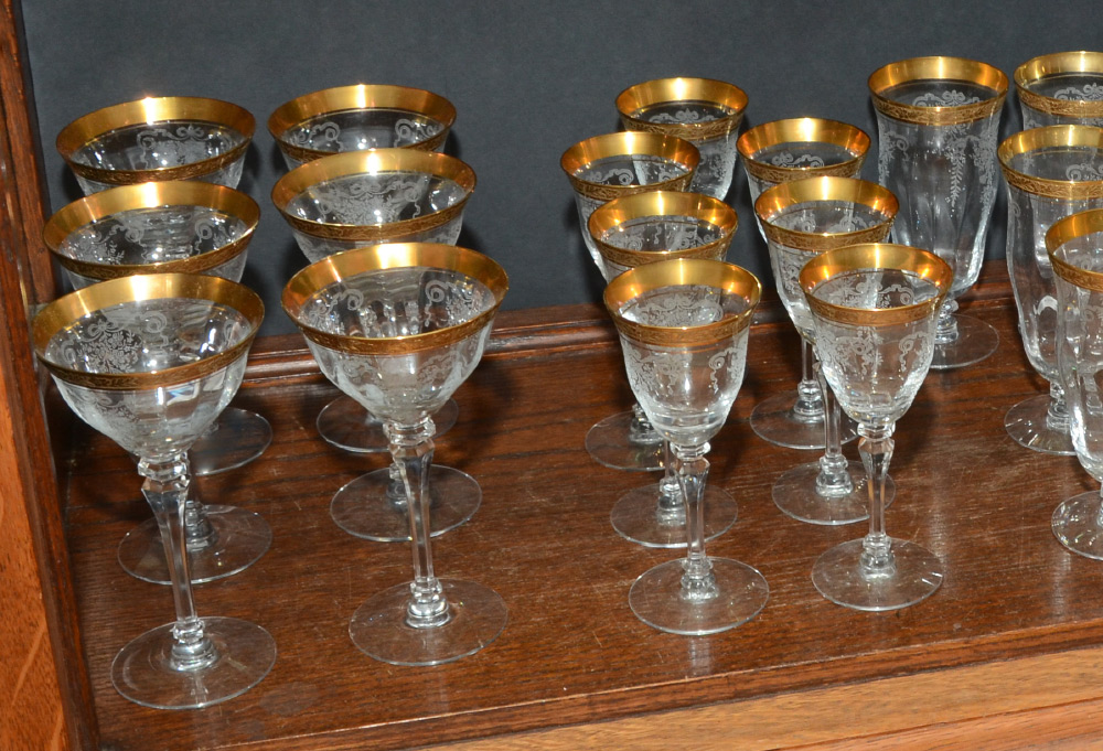 TIFFIN? ETCHED GOLD RIM STEMWARE: Approx. 29 pieces of gold encrusted rim, etched decoration, illegibly marked, possibly Tiffin, to include 6 water glasses (8 1/2''), 6 wine (7 1/4''), 10 iced tea (6 1/4''), 7 cordial or wine (6 3/4'').