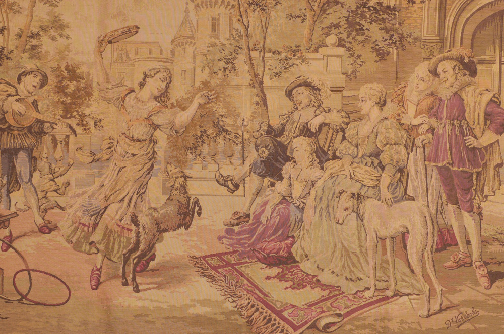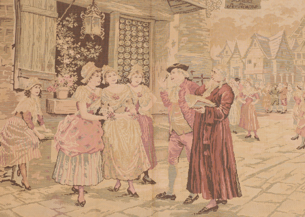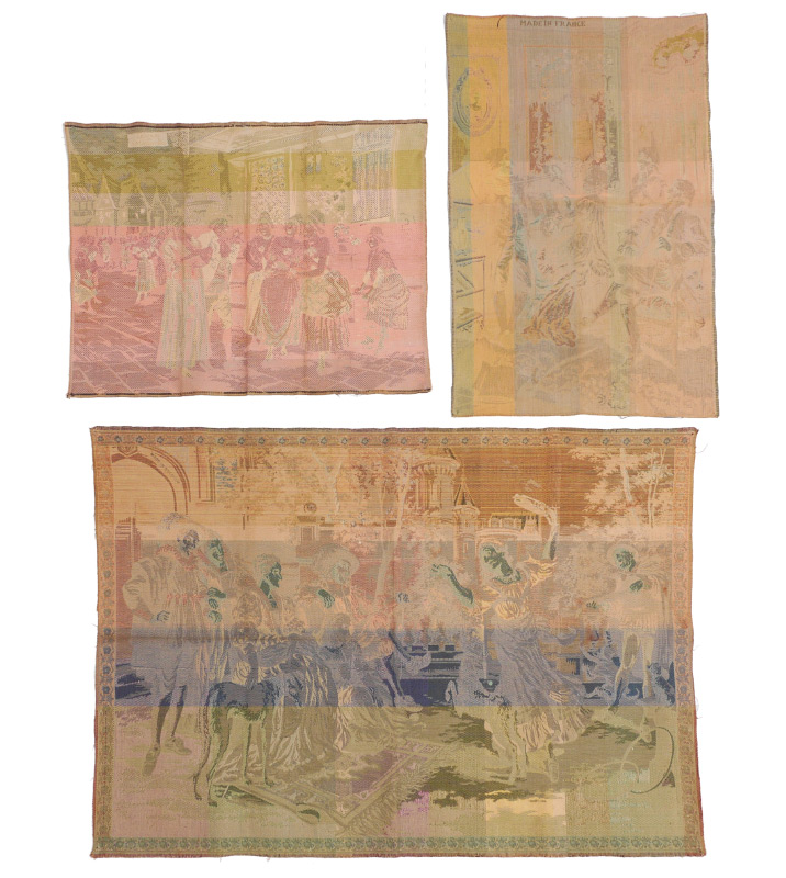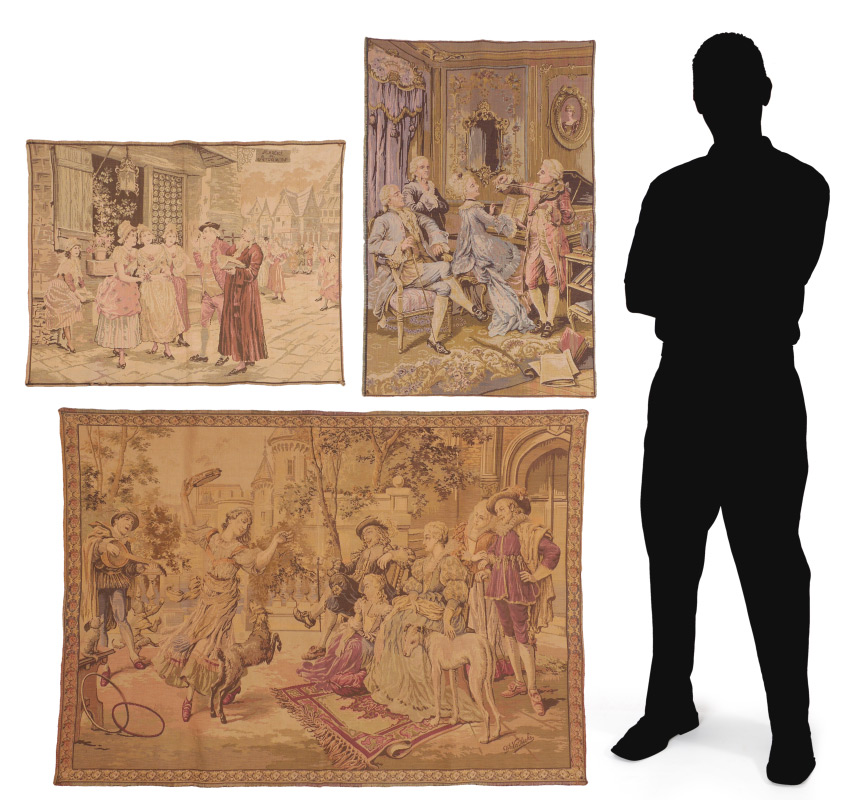 3 CONTINENTAL TAPESTRIES: 3 tapestries total to include 1) Interior genre scene of musicians, marked Made in France, 37 1/2'' x 25 1/2''. 2) Outdoor genre scene with priest and maidens. Banner reads ''Marche de Servantes'', 25 3/4'' x 34''. 3) Outdoor genre scene with small crowd watching minstrels, stamped Made in Belgium, 38 3/4'' x 56''.