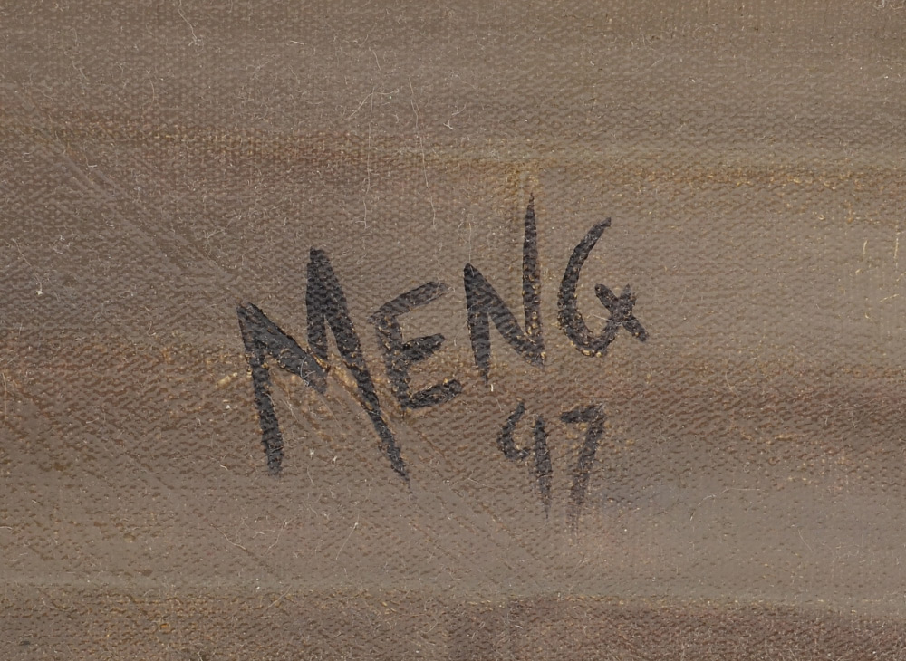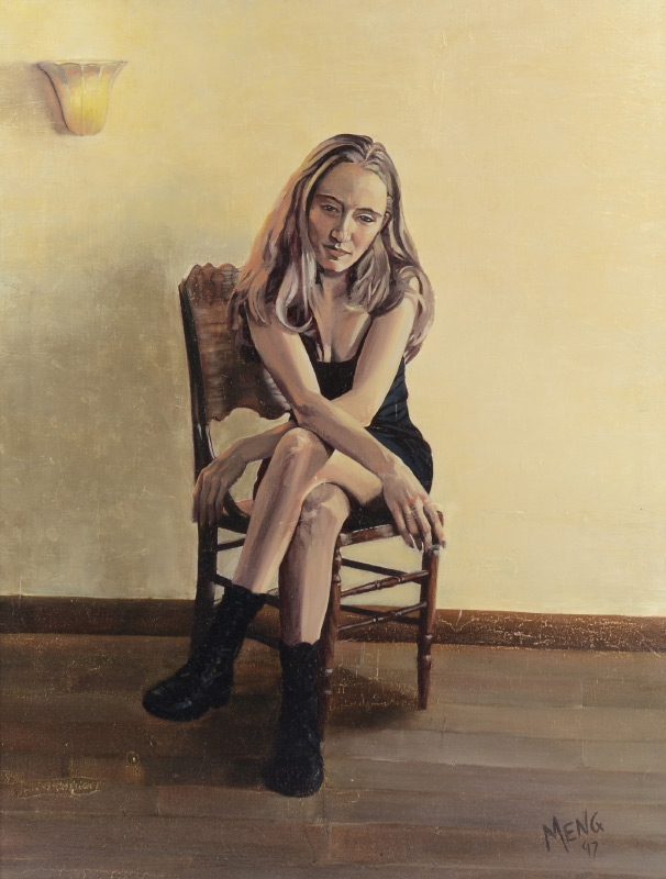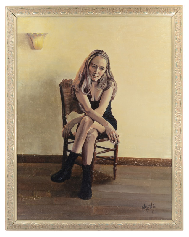 PENSIVE SEATED GIRL PAINTING SIGNED MENG: Pensive Seated Girl, Oil/Canvas, 34'' x 26'', signed lower right, dated '97, framed 37'' x 29''.