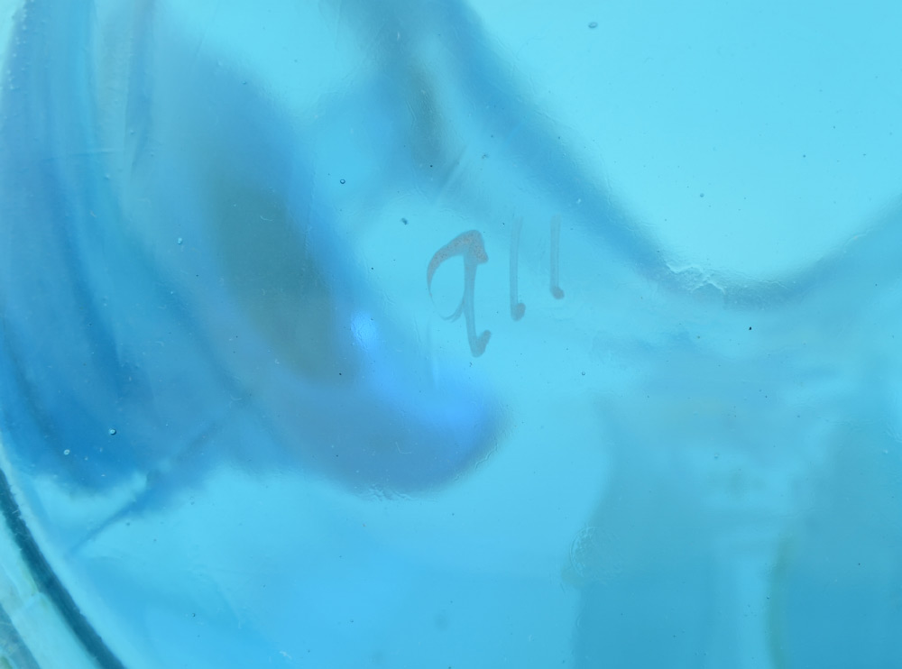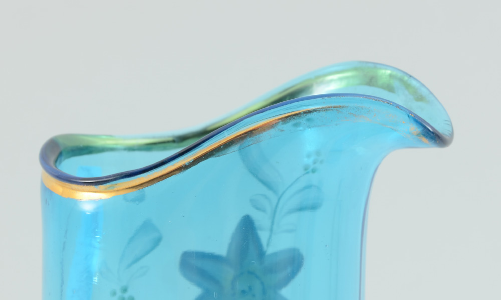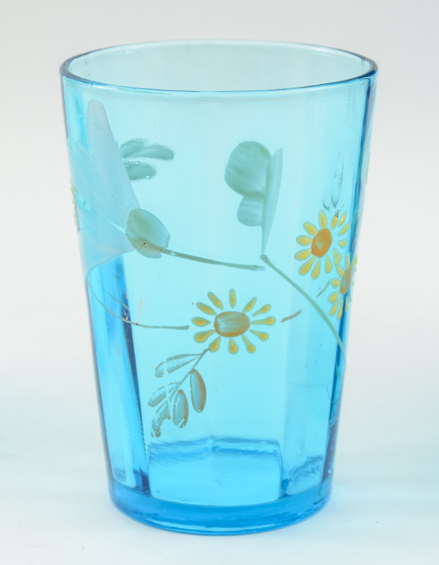 BLUE GLASS ENAMELED LEMONADE SET: 6 pieces total, blue glass enameled with floral decoration, pitcher 12'' h. x 7'' x 5 1/2'', cups 4'' h. x 3''.
