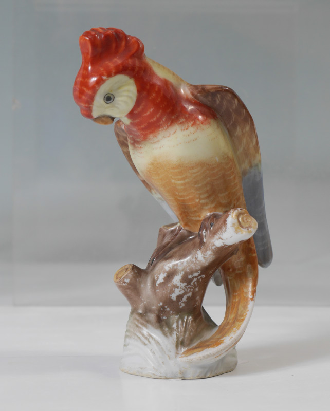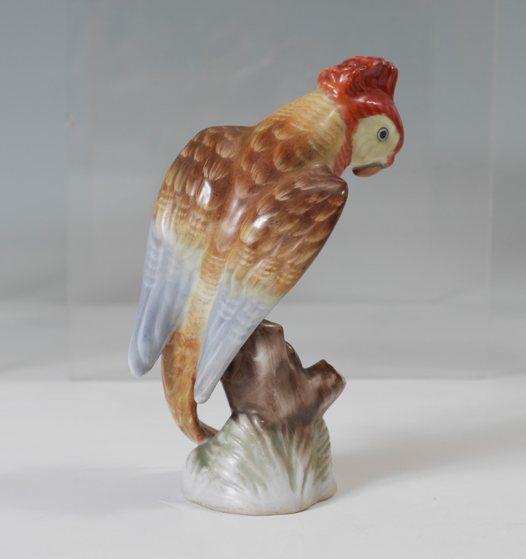 HEREND POLYCHROME PARROT PORCELAIN FIGURINE: Older Herend production, figure of a parrot on stump, impressed Herend and numbered 5009. 4 7/8'' h. x 3 1/4''.