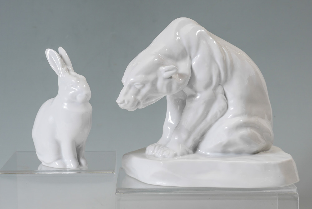 HEREND WHITE POLAR BEAR AND RABBIT FIGURINES: 2 figures total to include 1) Seated polar bear, signed Markup Bela, 1927 on back, impressed and stamped Herend marks, 5367, 7 1/2'' h. x 9 1/2''. 2) Seated white rabbit, impressed and stamped Herend marks, 5627, 5 1/4'' h.