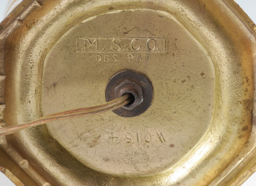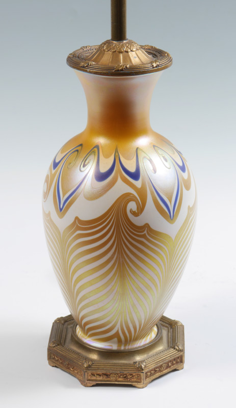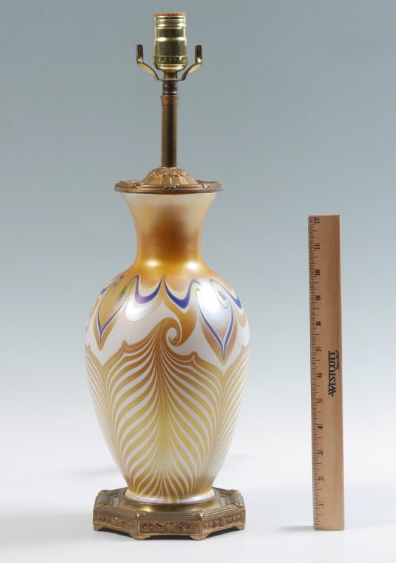 QUEZAL IRIDESCENT PULLED FEATHER TABLE LAMP: Attributed Quezal iridescent art glass body with pulled feather design ending in swirls. Gilt metal base marked M. S. Co., single socket fixture. Overall measures 20'' h. x 6 1/4''.