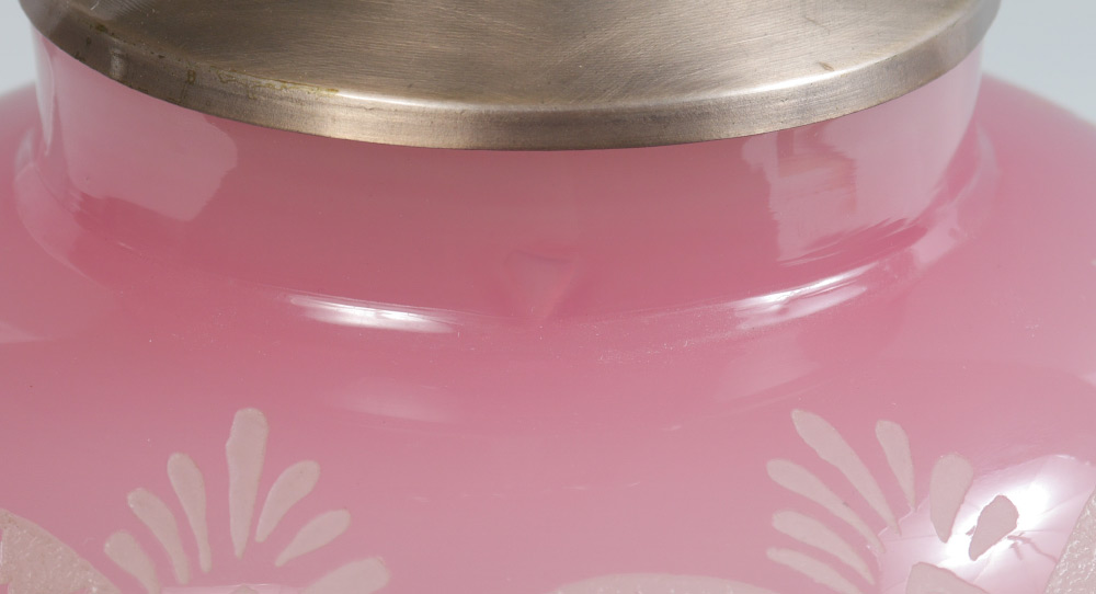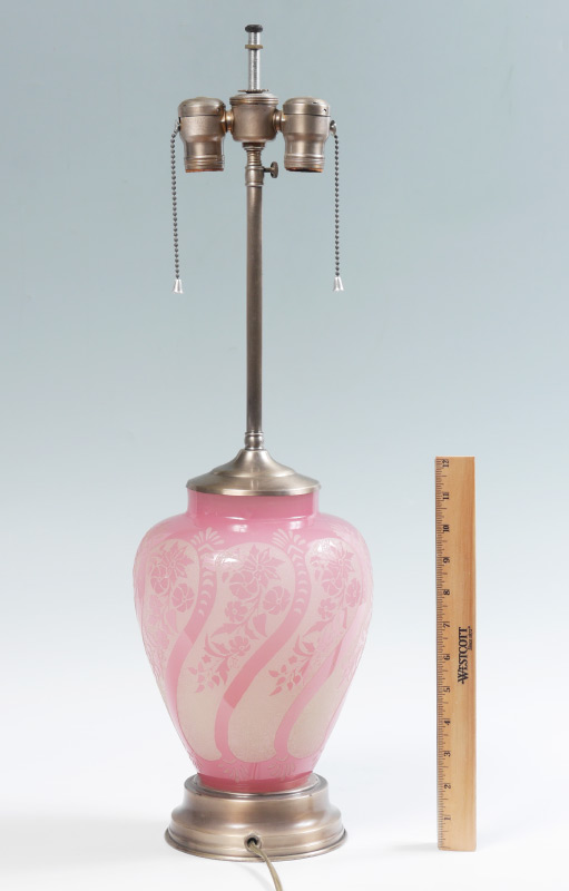 STEUBEN CUT BACK ROSALINE & ALABASTER LAMP: Repeating floral pattern rosaline acid cut to alabaster art glass body, metal base and cap. Double socket fixture, overall 25 1/2'' h. x 7''.