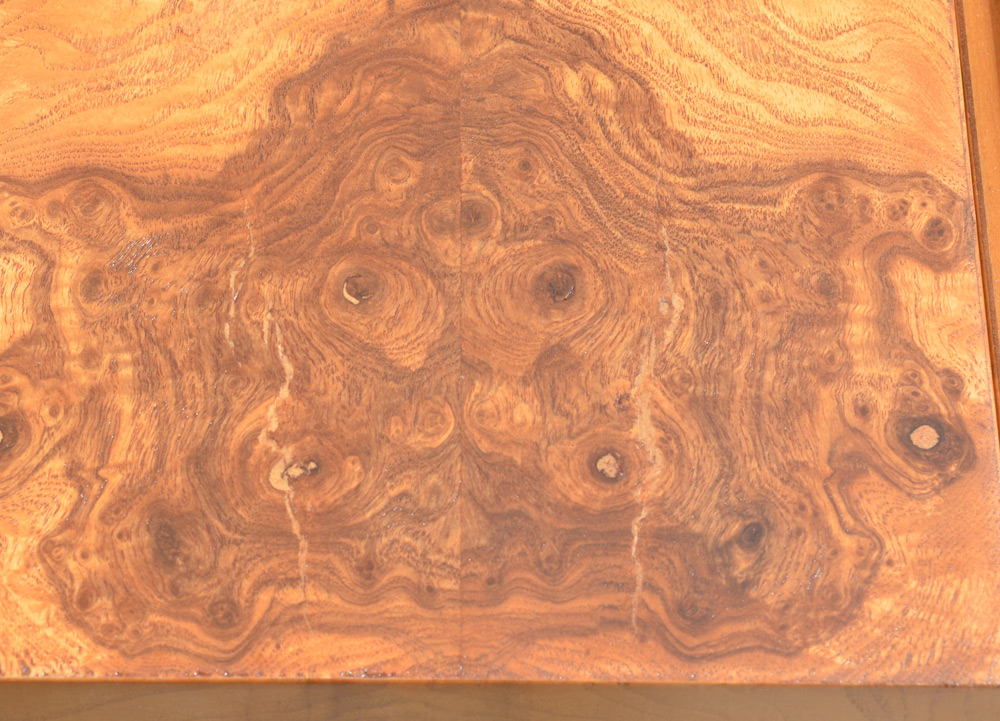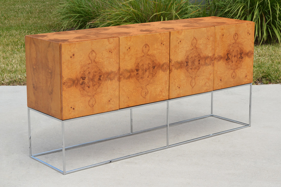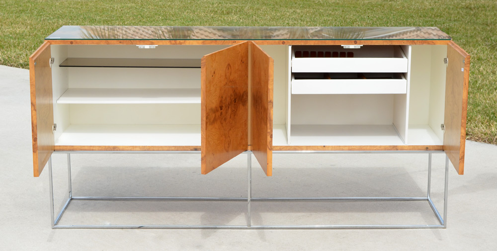 MILO BAUGHMAN FOR THAYER COGGIN 4 DOOR SIDEBOARD: Designed by Milo Baughman for Thayer Coggin, burl olive exterior, white interior, chrome steel base. Single shelf left side, 3 drawer right side, glass top. 34 1/4'' h. x 72'' x 18 1/4''.