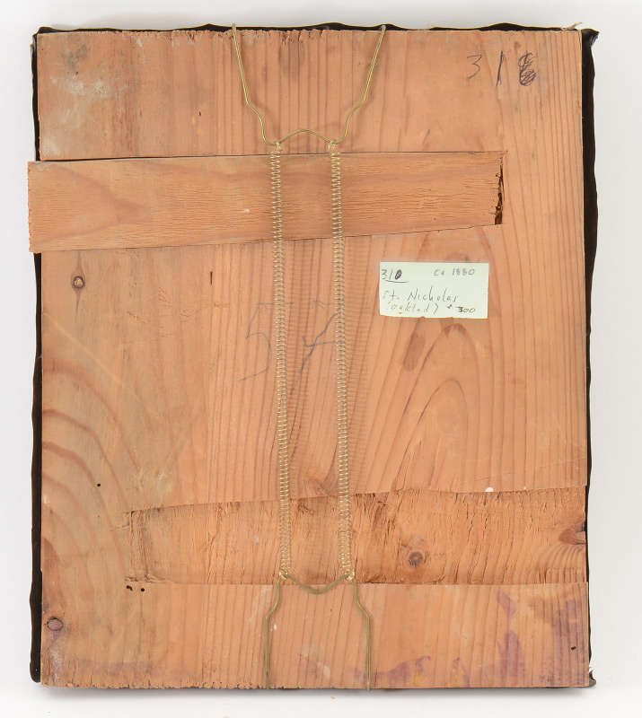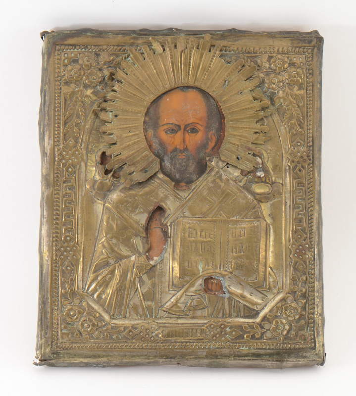 ICON OF SAINT NICHOLAS CIRCA 1880: Encased in a gold wash oak metal oklad, 12.25'' x 10.25''.