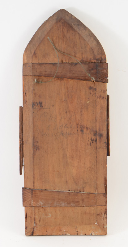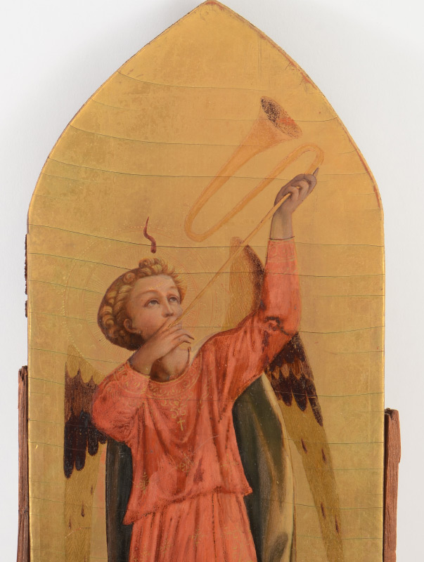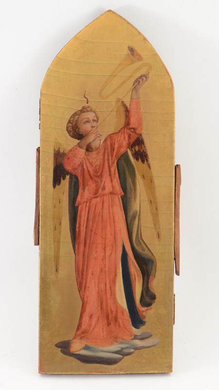 PAINTED WOOD PANEL WITH AN ANGEL TRUMPETING IN THE MANNER OF FRA ANGELICO: 16.5'' x 6 1/8'', unframed.