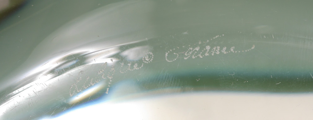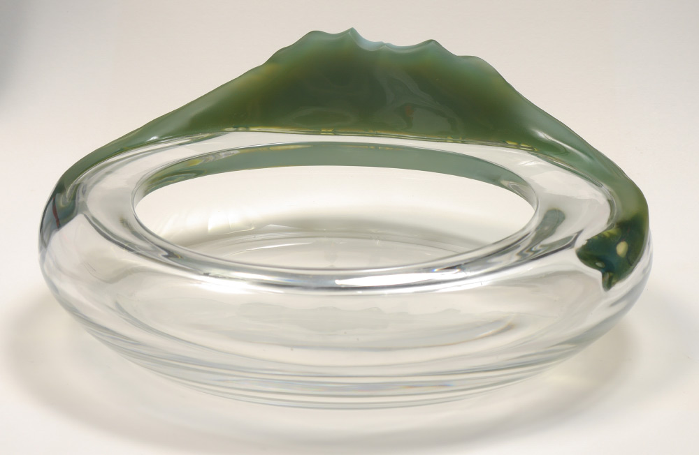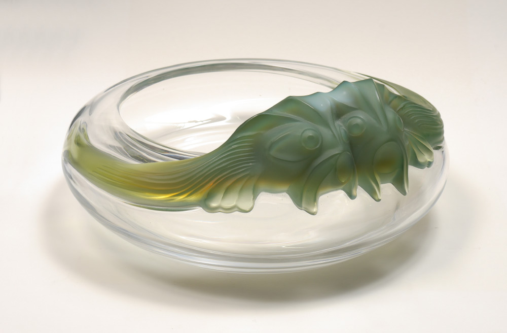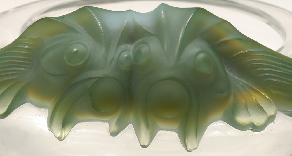 LALIQUE YESO DOUBLE FISH MOTIF BOWL: Stylized green fish applied to rim of clear glass bowl, signed Lalique France. 4'' h. x 9 1/4''.