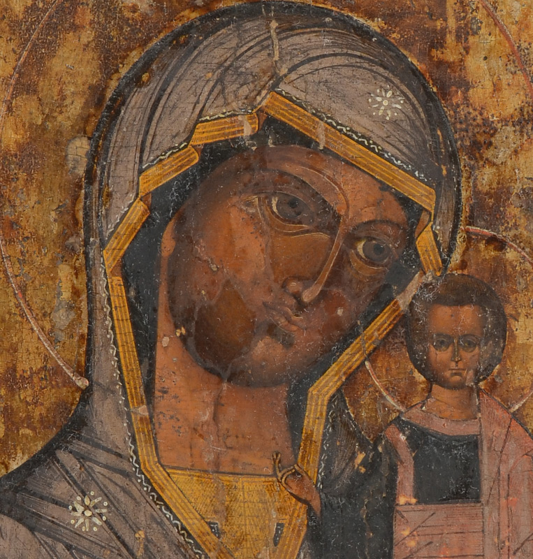 EARLY ICON OF MADONNA AND CHRIST CHILD: Oil on Bowed Wood Panel, 13.25'' x 10.25''.
