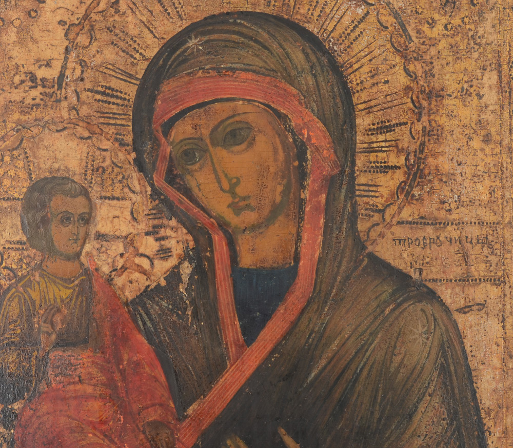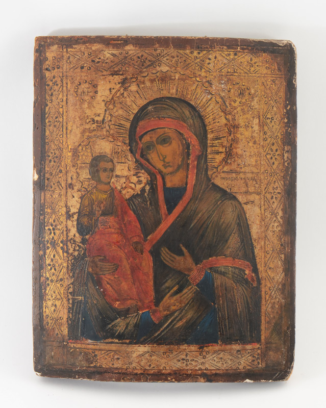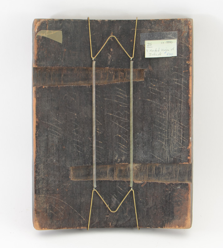 ICON OF THREE HANDED VIRGIN AND INFANT CHRIST: Oil/Cradled Panel, 13 3/8'' x 10'', circa 19th century.